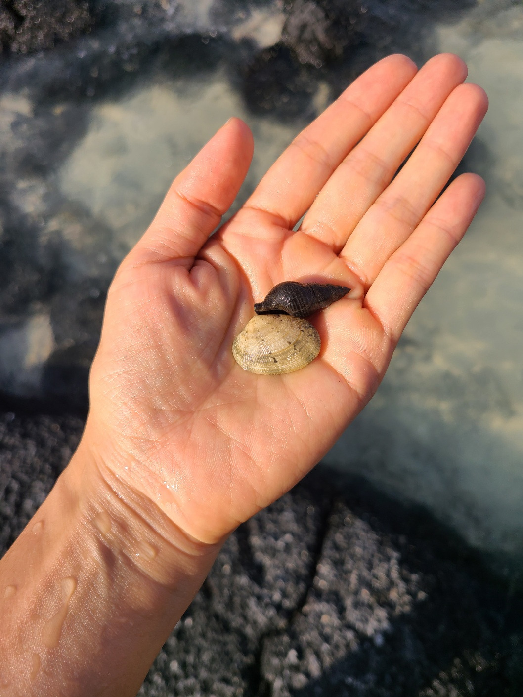 김녕 해수욕장의 바다빛깔은 탄성이 절로 나오게 하는 에메랄드 빛의 그라데이션 그 자체다. 모래는 하얗고 부드러웠으며 물은 또 얼마나 맑은지 감탄이 절로 나왔다. 그 맑은 물속에 다양한 온갖 생물들이 살고 있었다. 보말은 사람들이 많이들 잡아갔고 꽃게도 많이 보였다. 그럼에도 바위 곳곳에 붙어있는 조개류나 갑각류를 보면서 아직은 제주 바다가 이렇게 생명력 넘치고 맑고 깨끗해서 너무 다행이다, 오래오래 그렇게 계속 지켜졌으면 좋겠다는 생각을 했다.