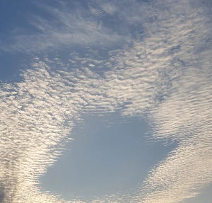 또 어느 날은 회색 구름이 하늘 전체를 덮고, 아래쪽에는 흰 구름이 수평으로 펼쳐져 있다. 그 사이에 한 조각 파란 하늘이 붓 터치한 듯 조금 얼굴을 내밀다가 이내 구름 사이로 푸른 강이 되어 도도히 흐르기도 한다. 화폭에 담으면 명화 못지않은 멋진 그림들을 선사해 주는 하늘이다.