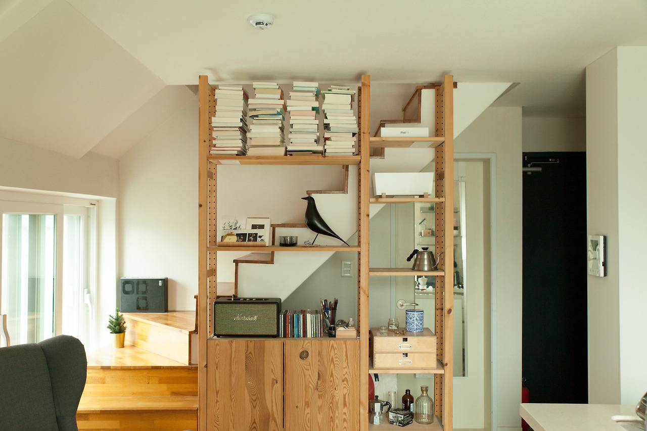 선반의 아래 두 칸에는 책을, 가장 위에는 스피커나 서랍 속에 두기엔 아까운 소품들을 올려두고 오며 가며 본다.