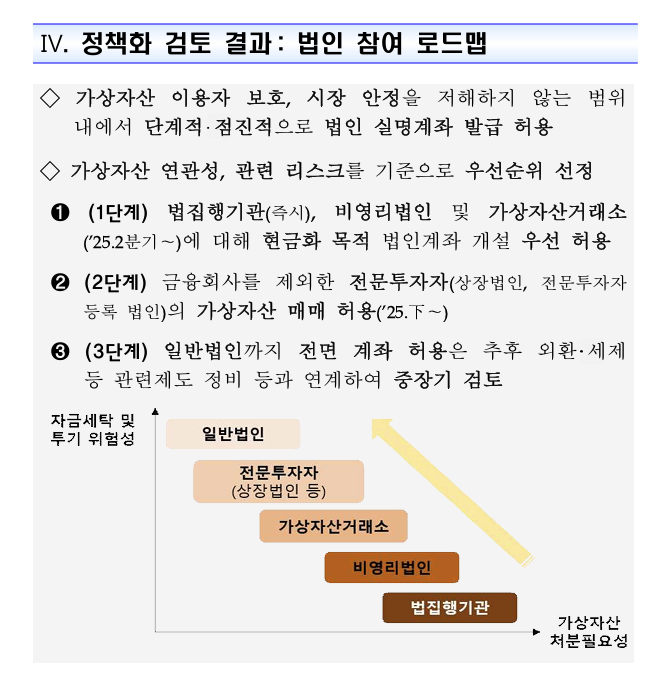 하지만 이제 변화의 조짐이 보이고 있다. 2024년 하반기부터는 가상자산 현금화가 필요한 기관(법집행기관, 비영리법인, 거래소 등)을 중심으로 실명계좌 발급이 허용되고, 이후 일정 요건을 갖춘 전문투자법인으로 점차 확대될 전망이다.