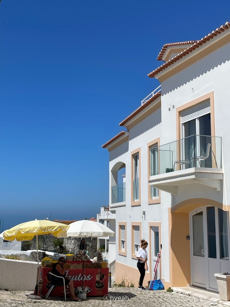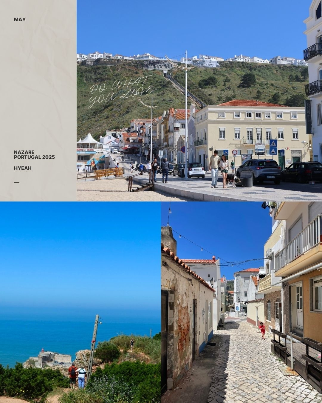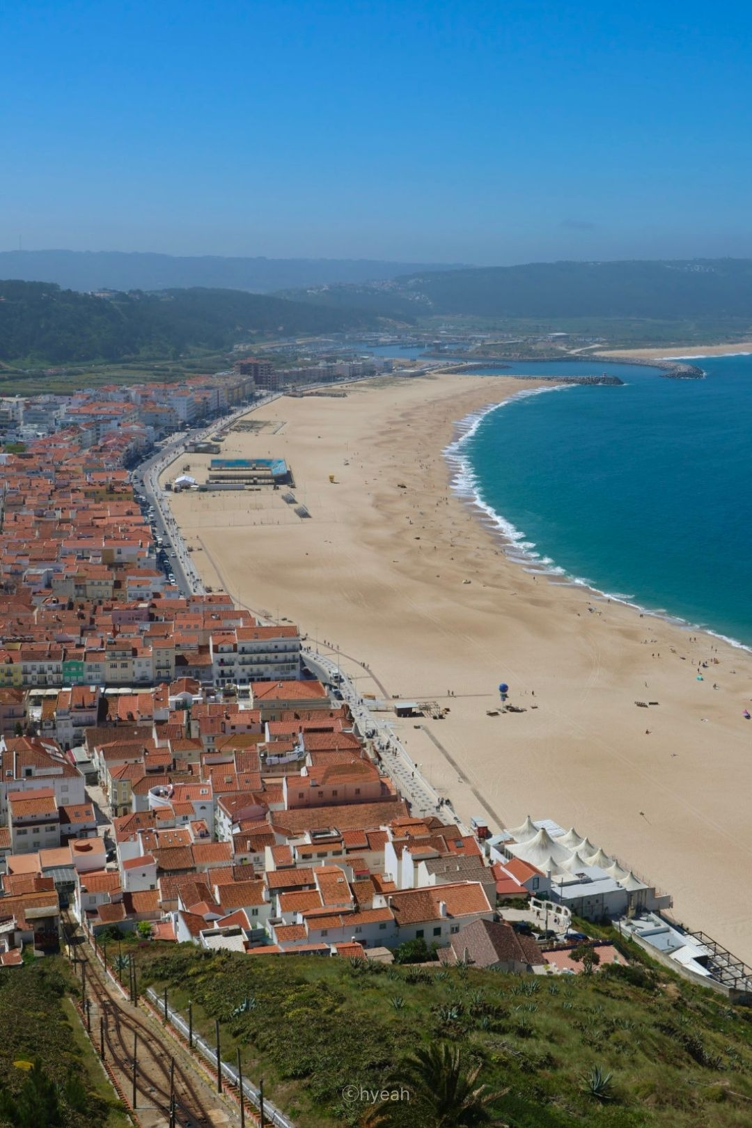 푸니쿨라를 타고 순식간에 언덕 위의 마을로 올라왔다. 초여름의 해변과 드넓은 모래사장, 아랫마을 '프라이아'가 한눈에 보인다. 대서양의 흐드러진 경계선은 푸니쿨라를 타고 올라온 시티오에서만 볼 수 있는 풍경이었다. 잔잔한 파도가 코앞에서 넘실거렸던 해변가에서는 아무리 고개를 뻗어도 보이지 않던 풍경. 같은 모습도 다르게 볼 수 있으니 어딘가 높은 곳에 오르는 것을 꺼리지 않고 즐기는 편이다. 전동식 케이블카가 없었어도 두 발로 뚜벅뚜벅 걸어 올라왔을 거라고 생각했다.