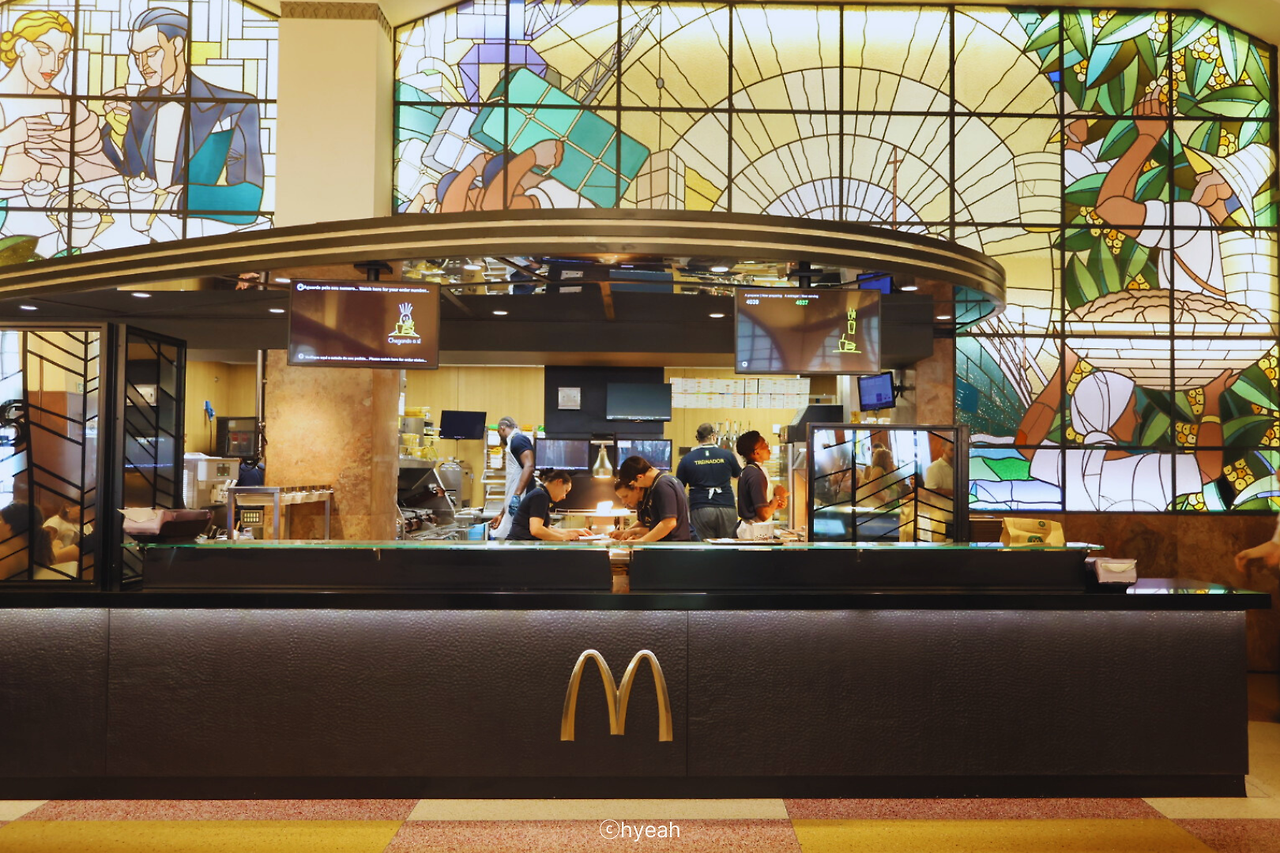 맥도날드 입점 시 내부 아르데코 장식의 주요 요소들을 보존, 복원하는 방식으로 리노베이션이 이루어졌다. 실내의 대형 스테인드 글라스는 포르투갈의 예술가 Ricardo Leone가 제작했는데, 카운터 뒤쪽의 그의 작품인 큰 유리화 또한 현재까지 원형 그대로 보존되고 있다.