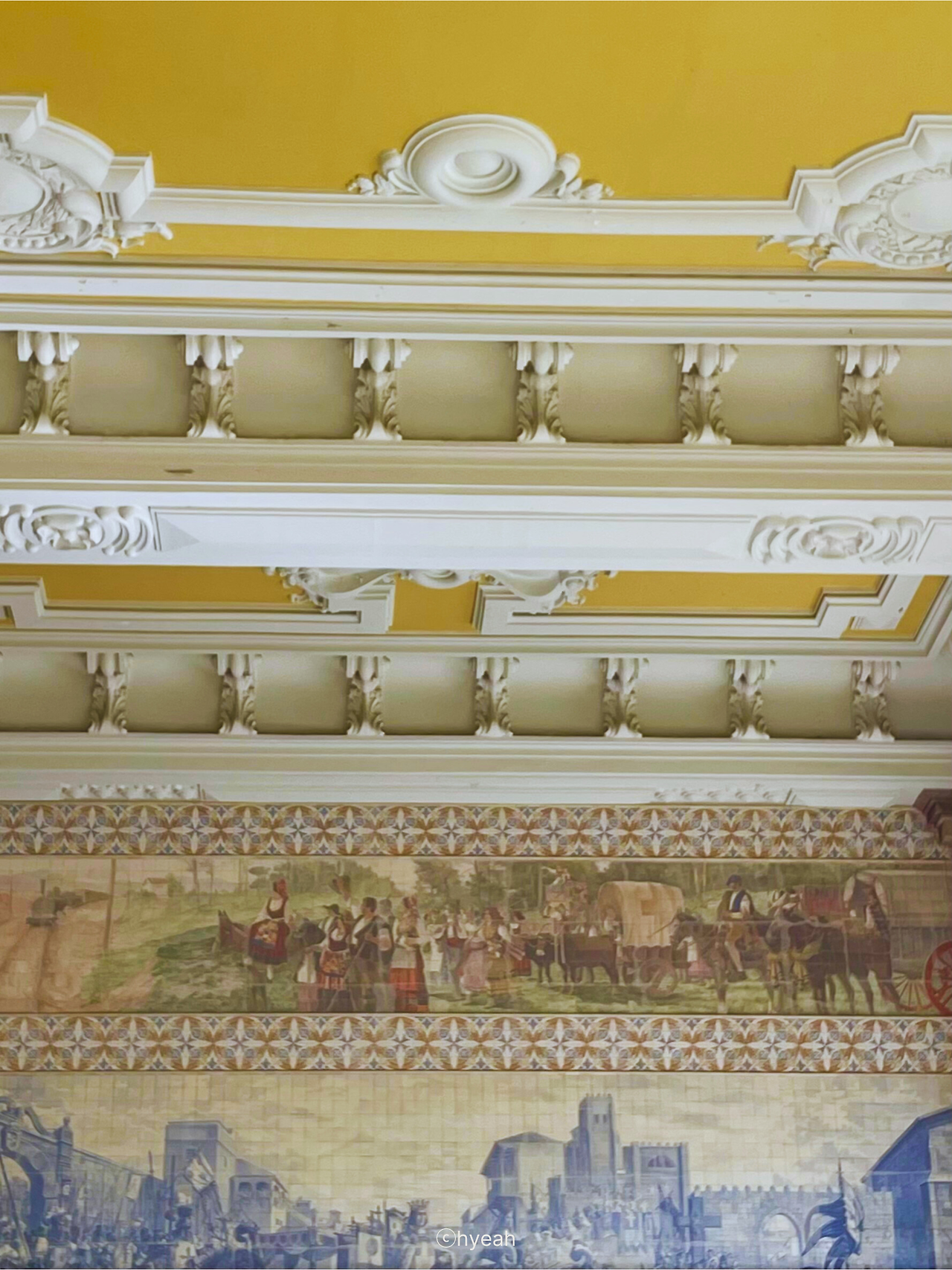 이 기차역을 유명하게 만든 건 대합실을 가득 채운 2만 장의 아줄레주다. 포르투 화가 '호르헤 콜라소'가 제작한 이 타일 벽화는 1905년 ~ 1916년 사이에 완공되었다. 포르투갈의 역사와 일상의 장면을 2만 장의 아줄레주 타일로 섬세하고 담고 있어 기차역 자체가 하나의 박물관과도 같은 기능을 하고 있는 것이다.