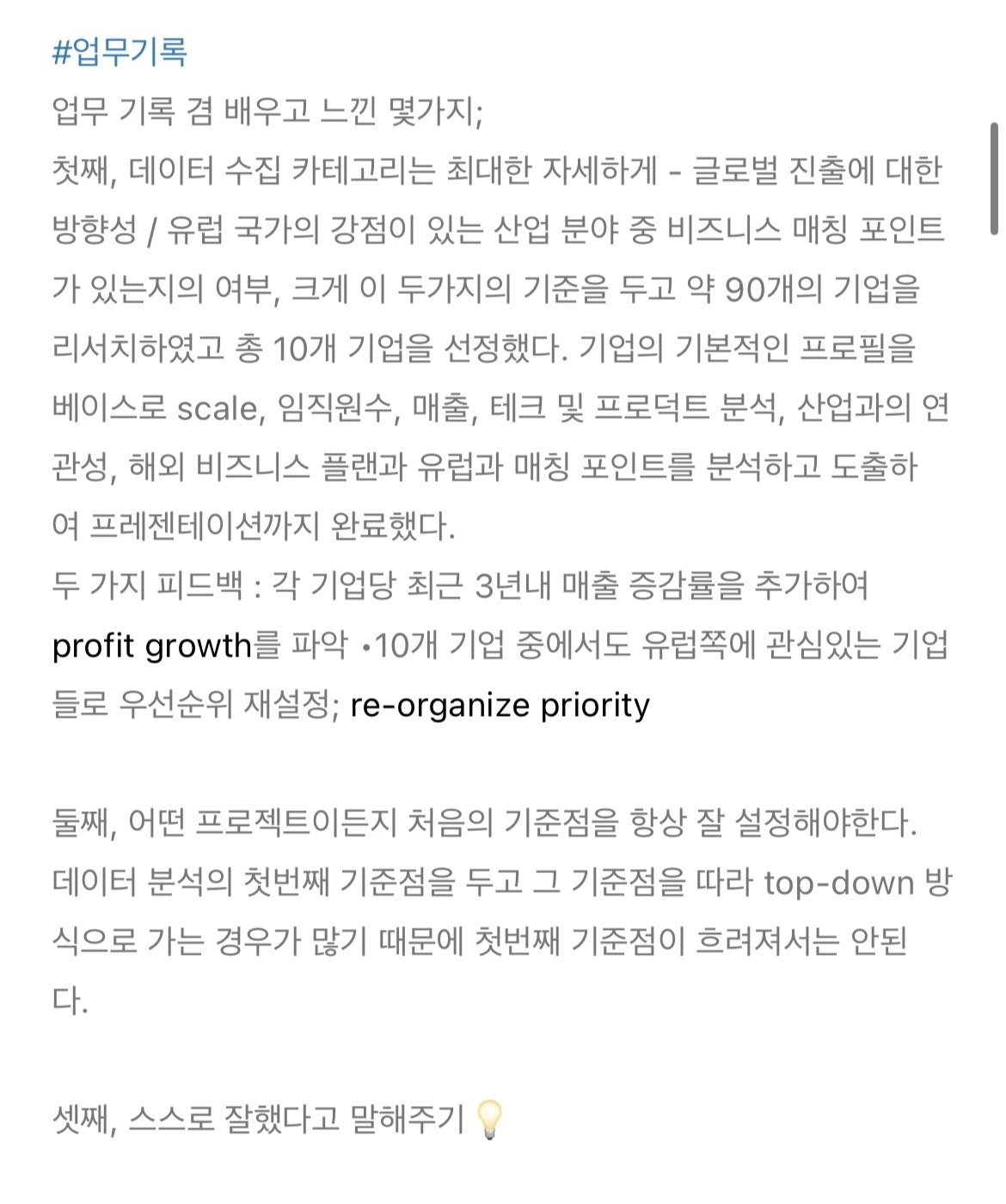 해당 업무는 월, 분기, 반기 보고서를 작성하고 추후 잠재적 투자 가능성이 있는 기업을 컨택하고 커뮤니케이션을 하는데 중요한 자료가 됩니다.