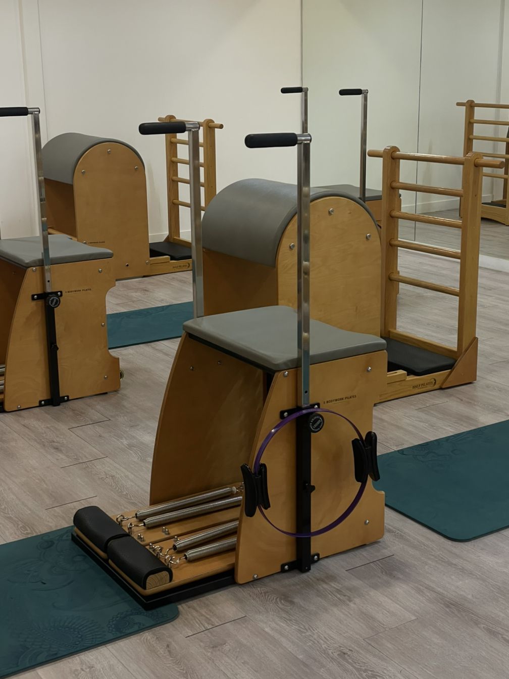 필라테스 대기구 중에서 '체어'라는 기구는 특히 하체 근력을 강화하는데 효과적이다. 내가 사용하는 체어에는 각기 다른 무게를 지닌 네 개의 스프링이 달려있는데 그 방향이 밑에서 위로 향하고 있다. 그 항중력을 이용하여 하체나 어깨 부분의 근력을 향상하는, 주로 난이도가 높은 동작을 체어를 통해 하고 있다.