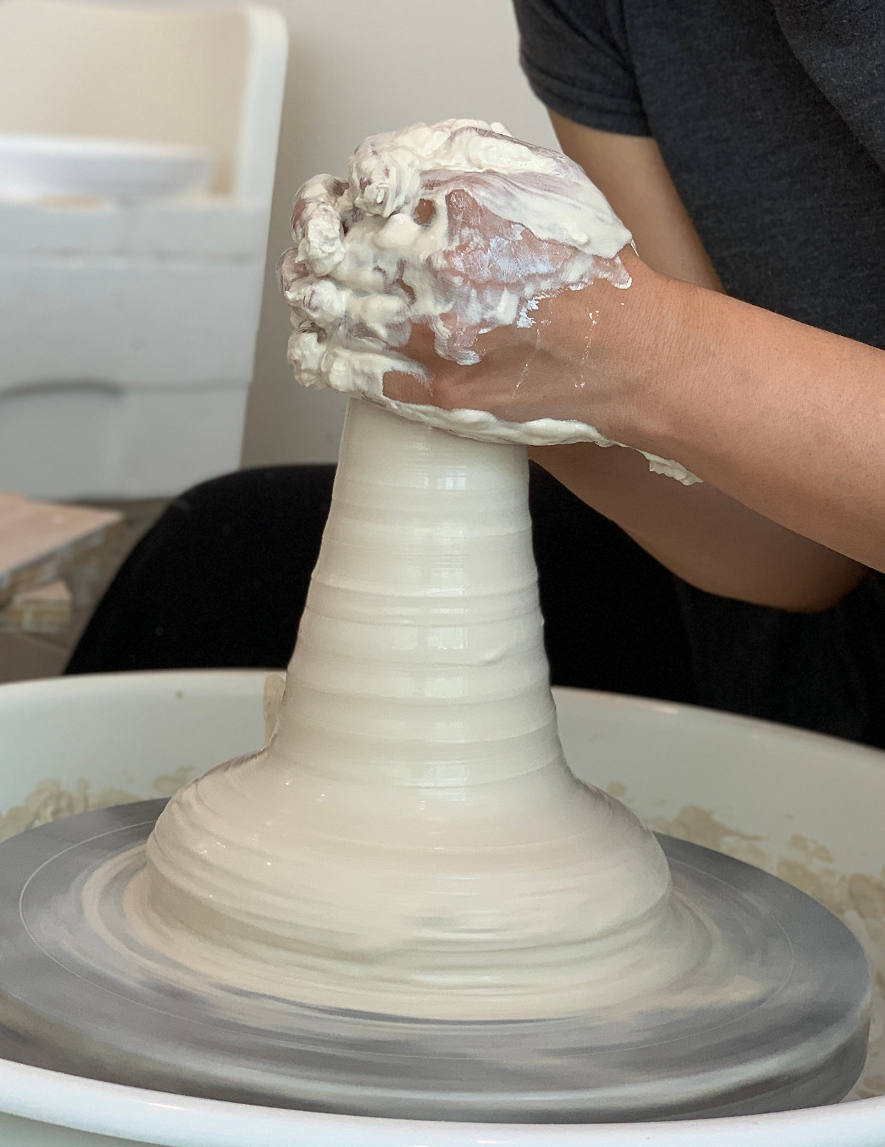 힘을 쥐어 올리고 내리다가 두 손이 마주치면 힘을 뺀다. 흙이 내 손 안에서 원심력을 이용해 제 중심을 잡을 때까지 1, 2초 기다려 주었다가 손을 뗀다.