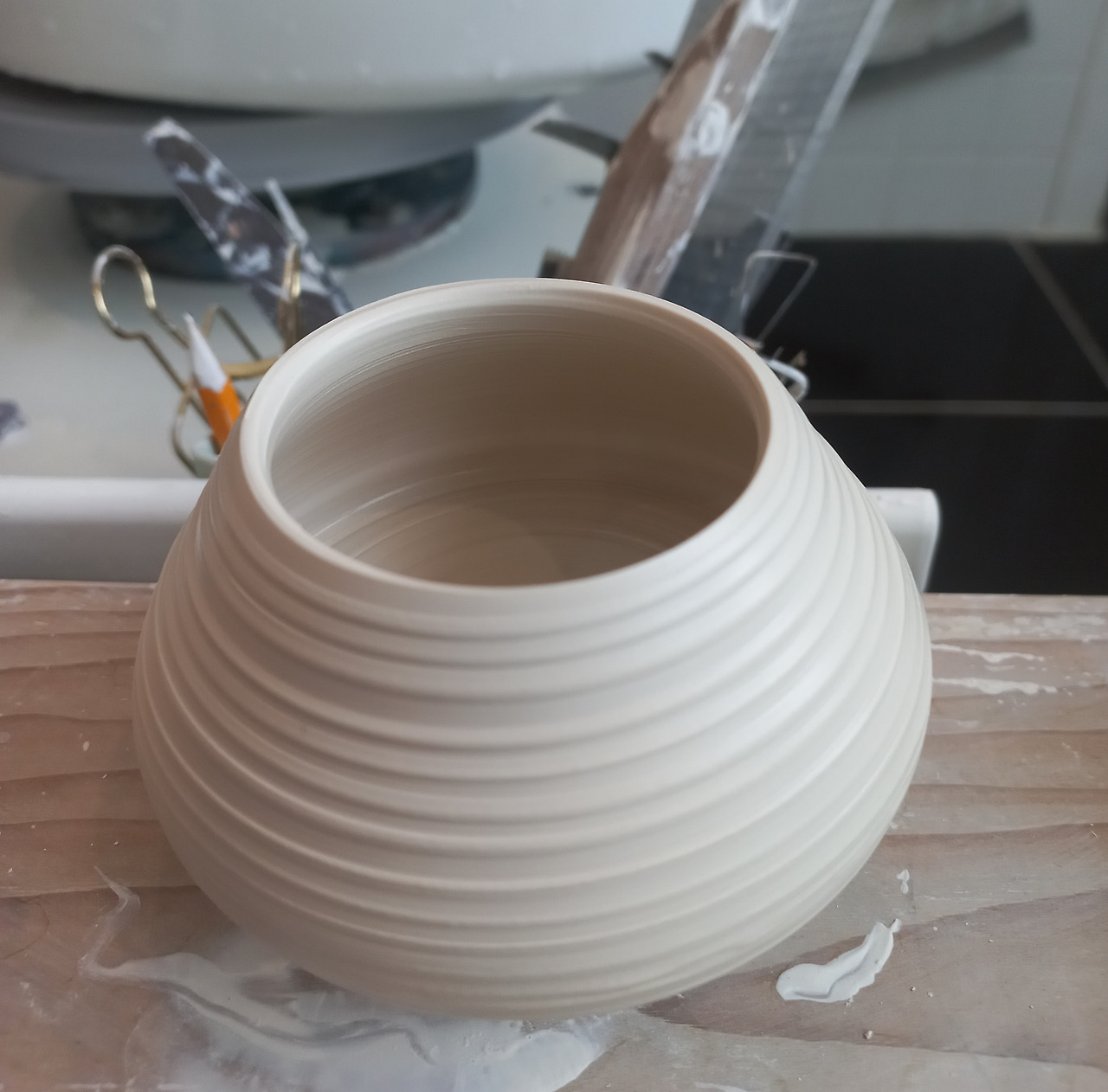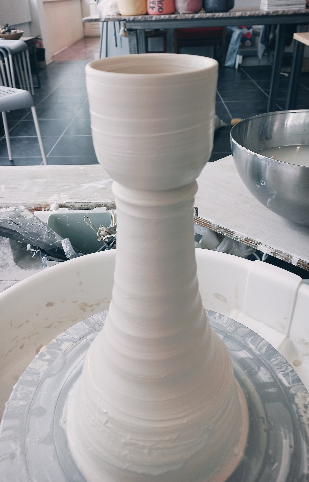 공방 선생님이 웃으며 자리를 잡는다. 중심 잡기를 해 놓은 흙을 부드럽게 쭉 끌어올리더니 흙 위쪽을 평평하게 편다.