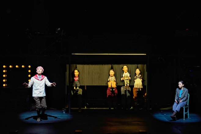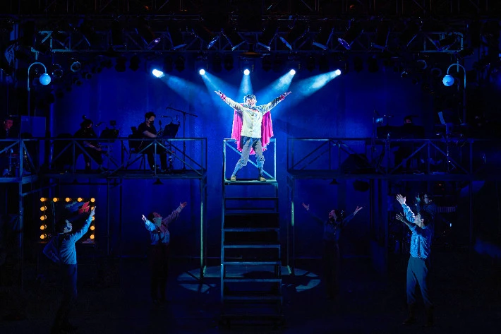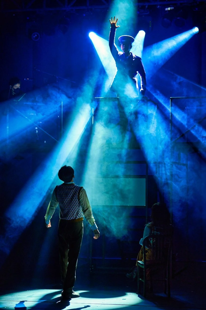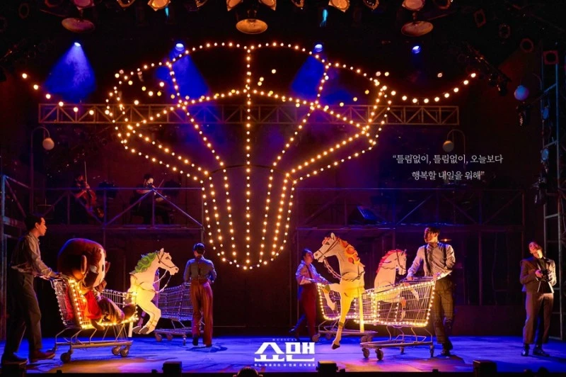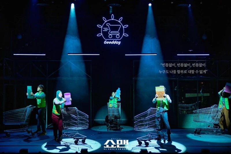 <쇼맨>의 무대는 비교적 단순화되어 있다. 2층 공간에는 연주자들이 무대 위에 노출되어 있고 푸른빛의 조명이 무대를 채운다. 이외에 특별한 대소도구는 놓여있지 않은 채로 무대는 비어있다. 무대 전환은 자유롭게 이동이 가능한 소품과 구조물로 이루어졌다. 중앙에는 카트 이미지가 박힌 채 ‘GOOD DAY’라고 적힌 네온사인은 극 공간을 한순간에 마트로 전환했다. 마트 쇼핑 카트는 앞면에 달린 말 조형물로 유원지의 회전목마가 되고 간이 계단은 후면을 강하게 비추는 핀 조명과 함께 독재자 미토스의 연설장이 된다. 주로 배우들이 직접 대도구를 옮기며 장면이 구성되었는데 그 흐름이 길어지면서 오히려 집중을 깨트리는 부분도 존재했다는 점에서는 일부 아쉬움이 남는다. 그럼에도 소품들의 변주와 다채로운 조명의 활용은 공간감을 효과적으로 구현해냈다.
