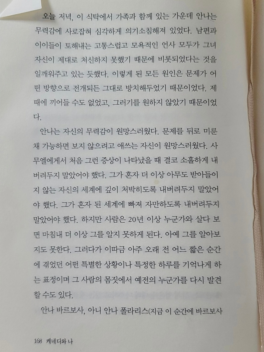 안나는 자신의 무력감이 원망스러웠다. 문제를 뒤로 미룬 채 가능하면 보지 않으려고 애쓰는 자신이 원망스러웠다. 사무엘에게서 처음 그런 증상이 나타났을 때 결코 소홀하게 내버려두지 말았어야 했다. 그가 혼자 더 이상 아무도 받아들이지 않는 자신의 세계에 깊이 처박히도록 내버려두지 말았어야 했다. 그가 혼자 된 세계에 빠져 자만하도록 내버려두지 말았어야 했다. 하지만 사람은 20년 이상 누군가와 살다 보면 마침내 더 이상 그를 알지 못하게 된다. 아예 그를 알아보지도 못한다. 그러다가 이따금 아주 오래 전 어느 짧은 순간에 겪었던 어떤 특별한 상황이나 특정한 하루를 기억나게 하는 표정이며 그 사람의 몸짓에서 예전의 누군가를 다시 발견할 수도 있다.