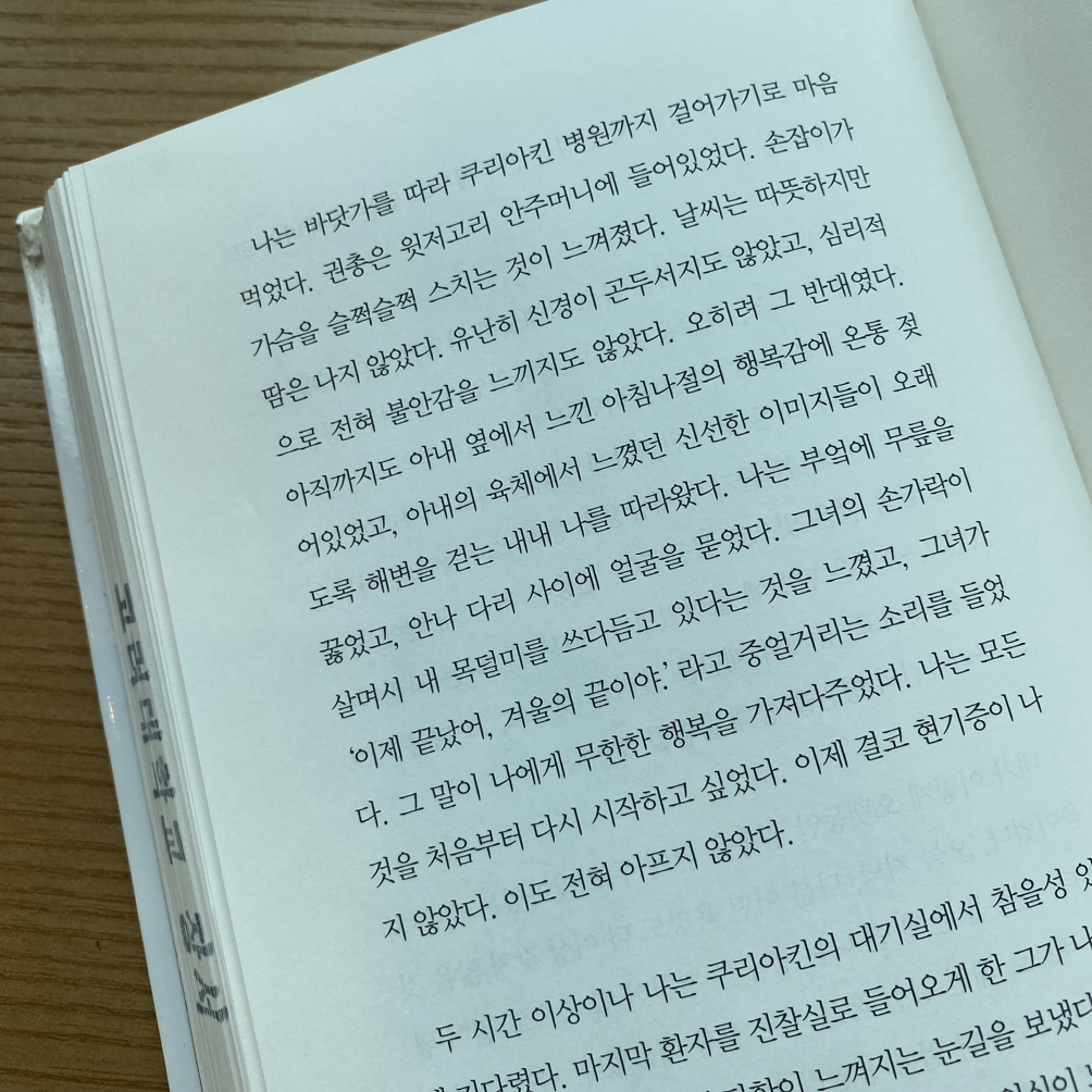 나는 이런 시간, 우리를 둘러싸고 있는 고요와 아라비카 커피 냄새에 뒤섞인 담배 냄새가, 가전제품에 눈처럼 환한 빛을 주는 눈부신 햇살이, 우리가 말하고 난 다음에 찾아오는 전혀 어색하지 않은 긴 침묵이 참으로 좋았다. 앞으로 다가올, 온전히 내 것이 되려고 하는 낮이 나는 정말 좋았다.