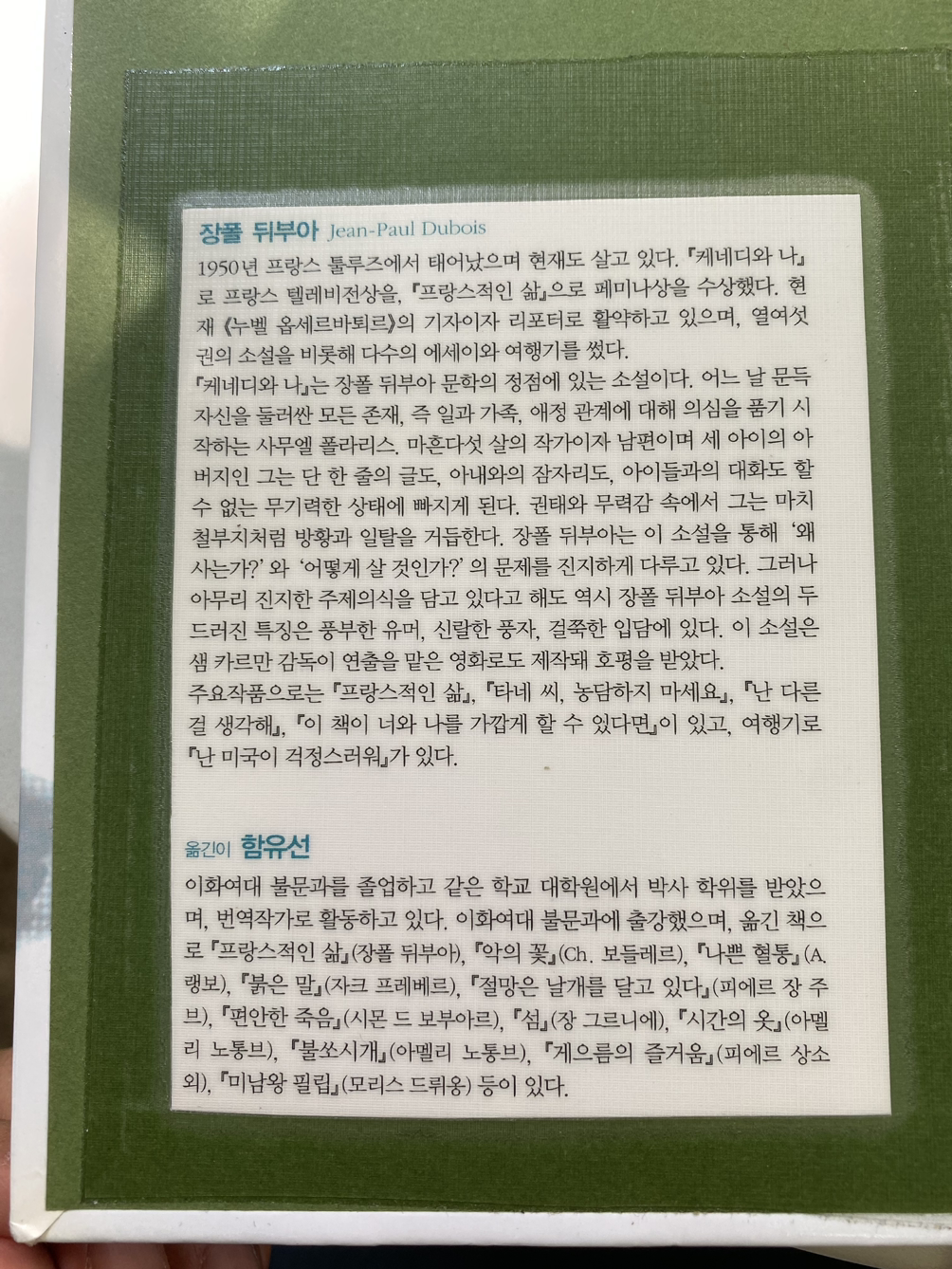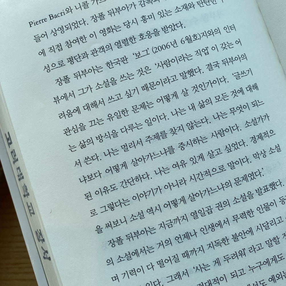 장폴 뒤부아는 한국판 ‘보그’(2006년호 6월호)지와의 인터뷰에서 그가 소설을 쓰는 것은 ‘사람이라는 직업’이 갖는 어려움에 대해서 쓰고 싶기 때문이라고 말했다. 결국 뒤부아의 관심을 끄는 유일한 문제는 어떻게 살 것인가이다. ‘글쓰기는 삶의 방식을 다루는 일이다. 나는 내 삶의 모든 것에 대해서 쓴다. 나는 멀리서 주제를 찾지 않는다. 나는 무엇이 되느냐보다 어떻게 살아가느냐를 중시하는 사람이다. 소설가가 된 이유도 간단하다. 나는 여유 있게 살고 싶었다. 경제적으로 그렇다는 이야기가 아니라 시간적으로 말이다. 막상 소설을 써보니 소설 역시 어떻게 살아가느냐의 문제였다.’