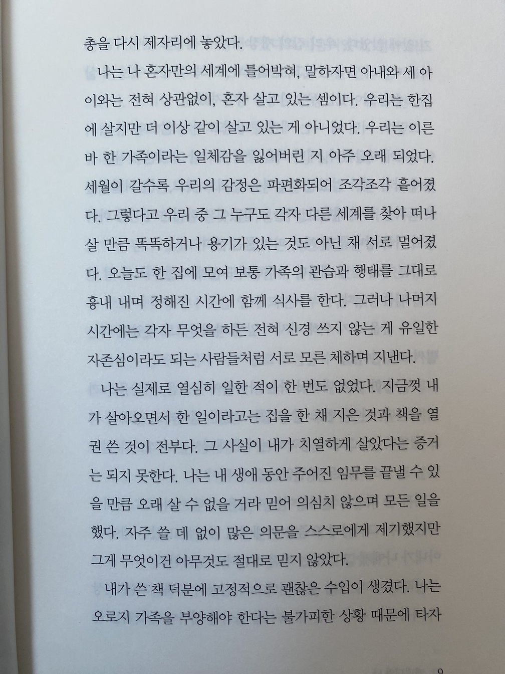 나는 나 혼자만의 세계에 틀어박혀, 말하자면 아내와 세 아이와는 전혀 상관없이, 혼자 살고 있는 셈이다. 우리는 한집에 살지만 더 이상 같이 살고 있는 게 아니었다. 우리는 이른바 한 가족이라는 일체감을 잃어버린 지 아주 오래 되었다. 세월이 갈수록 우리의 감정은 파편화되어 조각조각 흩어졌다. 그렇다고 우리 중 그 누구도 각자 다른 세계를 찾아 떠나갈 만큼 똑똑하거나 용기가 있는 것도 아닌 채 서로 멀어졌다. 오늘도 한 집에 모여 보통 가족의 관습과 행태를 그대로 흉내 내며 정해진 시간에 함께 식사를 한다. 그러나 나머지 시간에는 각자 무엇을 하든 전혀 신경 쓰지 않는 게 유일한 자존심이라도 되는 사람들처럼 서로 모른 체하며 지낸다.