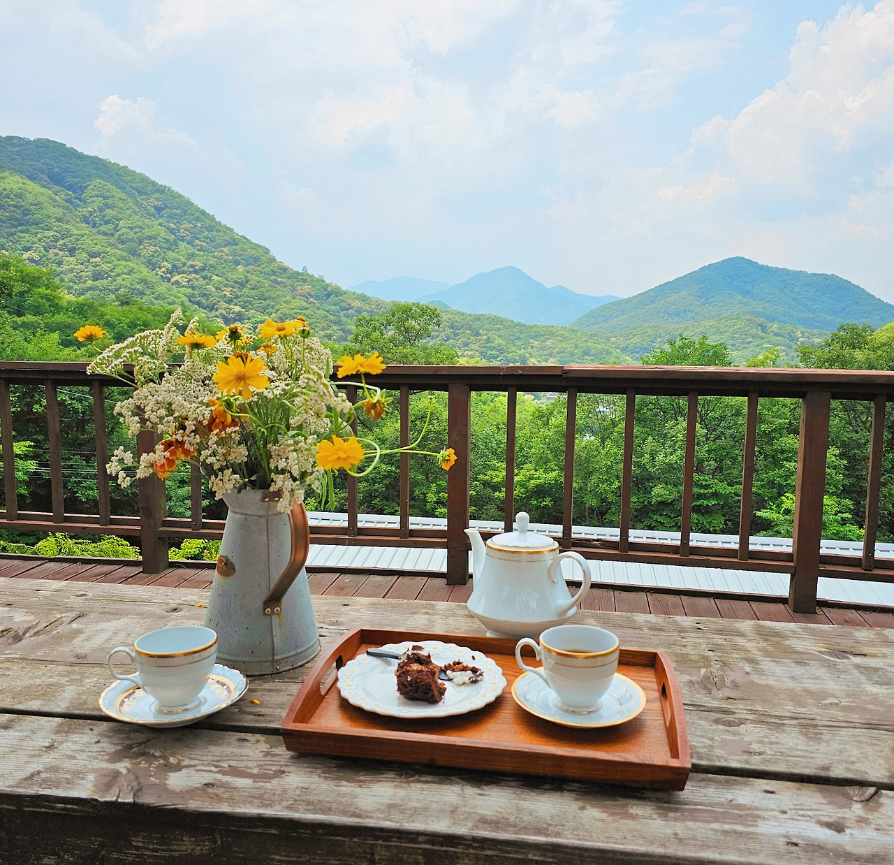 날이 좋을 때면 가족들과 함께 마당에 나가 커피나 차, 간단한 디저트를 나눠 먹는다. 이때는 강아지들도 함께 나와 마당을 산책하는데, 잔디 사이사이에 뿌려둔 간식을 찾아먹는 노즈워킹 시간이기도 하다. 요즘에는 마당에 넘치도록 핀 꽃 몇 줄기를 잘라 화병에 꽂아두는 엄마 덕분에 눈이 더 즐겁다. 음악을 틀지 않아도 새소리가 들리고, TV를 켜지 않아도 멋진 풍경이 보이는 마당에서 차를 마시고 있자면 시골에 살길 정말 잘했다는 생각이 든다.