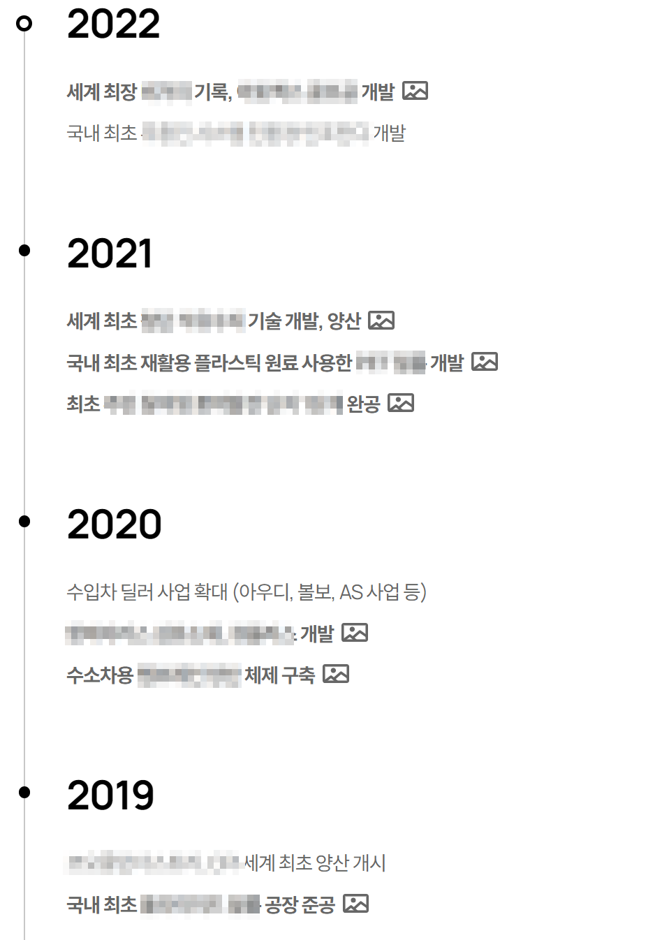 이뿐만 아니라, B기업은 ESG경영에도 관심이 많을 확률이 높다. 한 해에 2~3개의 성과만을 담은 간결한 연혁을 유지하고 있는데, 그중 재활용 플라스틱 원료나 수소차용 체제 구축과 같은 친환경적 성과를 넣었다는 사실에서 친환경을 중요한 키워드로 여기고 있다는 걸 쉽게 눈치챌 수 있다.