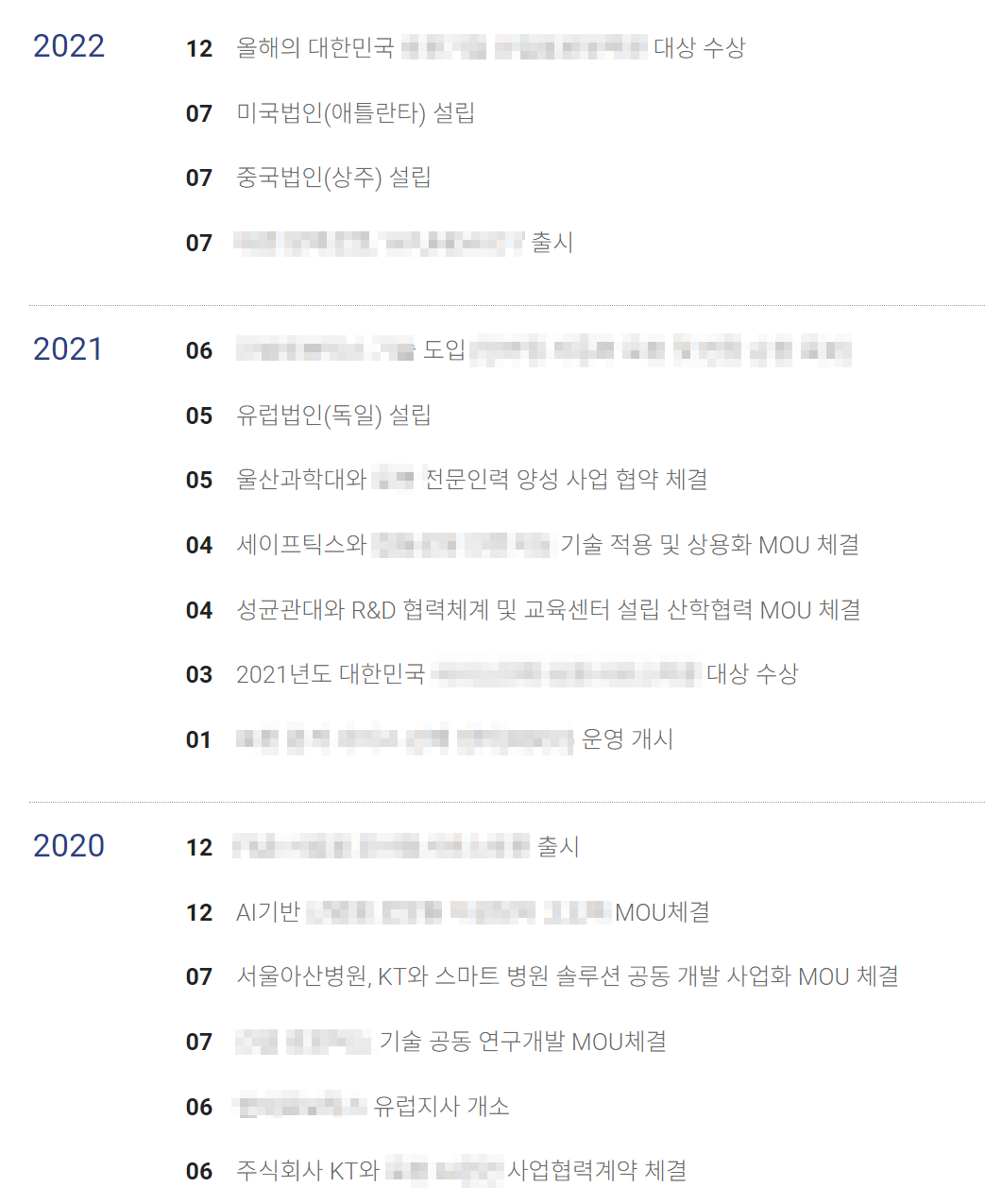 이해를 돕기 위해, 두 대기업의 연혁을 살펴보자. 해당 기업과 분야가 중요한 것이 아닌 단순 예시일 뿐이기 때문에, 분야를 특정하는 몇 키워드는 모자이크 처리했다. 왼쪽 A기업의 예시 속에서는 MOU 체결이라는 단어가 반복된다. 그중에서도 2021년 교육기관과 산학협력을 맺었다는 내용이 두 차례 등장하는데, 이를 통해 이 기업이 단순히 기술을 개발하고 영업이익을 늘리는 것을 넘어, 미래지향적인 시선으로 인재 양성에도 힘쓰려 한다는 사실을 유추해 볼 수 있다.