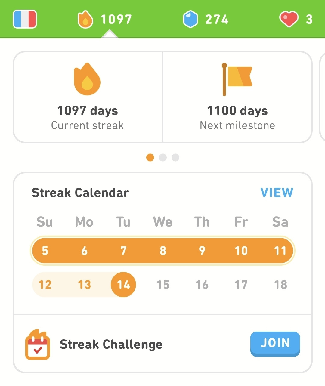 듀오링고로 프랑스어 한 세트를 끝내는 데는 5분도 걸리지 않는다. 물론 여러 세트를 한다면 실력이 훨씬 빨리 늘겠지만, 나에게 필요한 건 꾸준함이지 엄청난 실력이 아니었다.