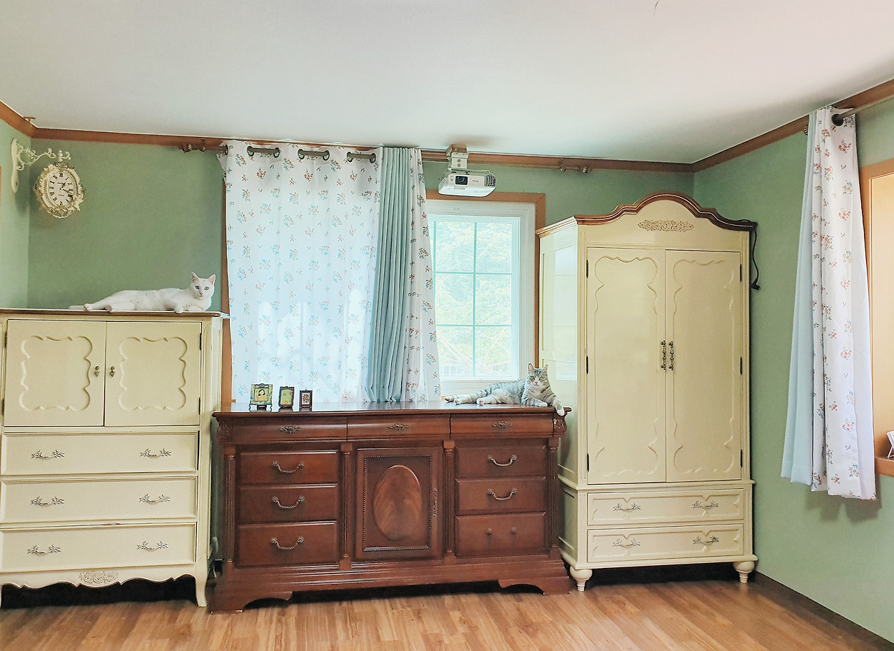 올리브그린 페인트로 벽을 다 칠해버리고 못생긴 블라인드도 예쁜 꽃무늬 커튼으로 바꿨다. 당근마켓에서 버터색 옷장과 마호가니 서랍장을 구했다. 빈티지 가구는 정말 비싸지만, 중고 마켓을 잘 찾으면 좋은 제품이 정말 헐값에 올라올 때가 있다! 당시 나는 득템해 내겠다는 마음으로 당근에 '엔틱'을 키워드 알림 걸어놓고 올라오는 글은 전부 다 확인했었다.