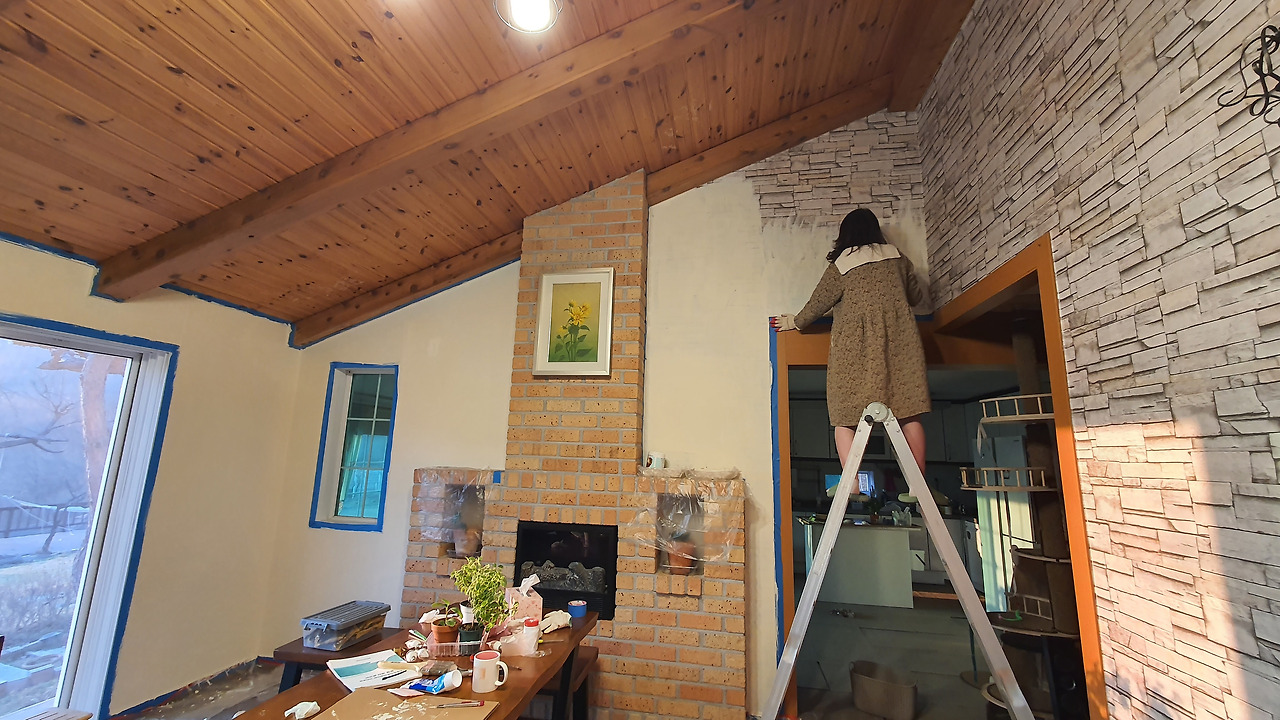 페인트를 칠하려면 벽지를 모두 뜯어내야 하나 잠시 암담해졌지만, 셀프 인테리어 사례를 찾아보니 그냥 벽지 위에 페인트를 발라버리는 것도 좋은 방법이라는 글이 많았다. 그렇게 아빠와 언니가 출근한 사이 엄마와 둘이서 열심히 벽을 칠하기 시작했다.