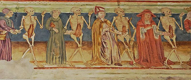 중세에 대 유행했던 '당스 마카브르(Danse Macabre) 라는 모티프는 해골로 형상화된 죽음이 살아 있는 사람들 곁에서 춤을 추고, 사람들이 이 죽음의 춤에 경악하는 모습을 묘사했습니다. 이는 당시에 절대적이었던 신분의 높고 낮음, 또 살아 있는 때의 (외형적) 미추에 상관없이 죽은 다음에는 누구나 똑같이 뼈만 남은 해골이 된다는 퍽 강렬한 메시지로, 사람들에게 죽음의 절대성을 일깨우는 역할을 했습니다.