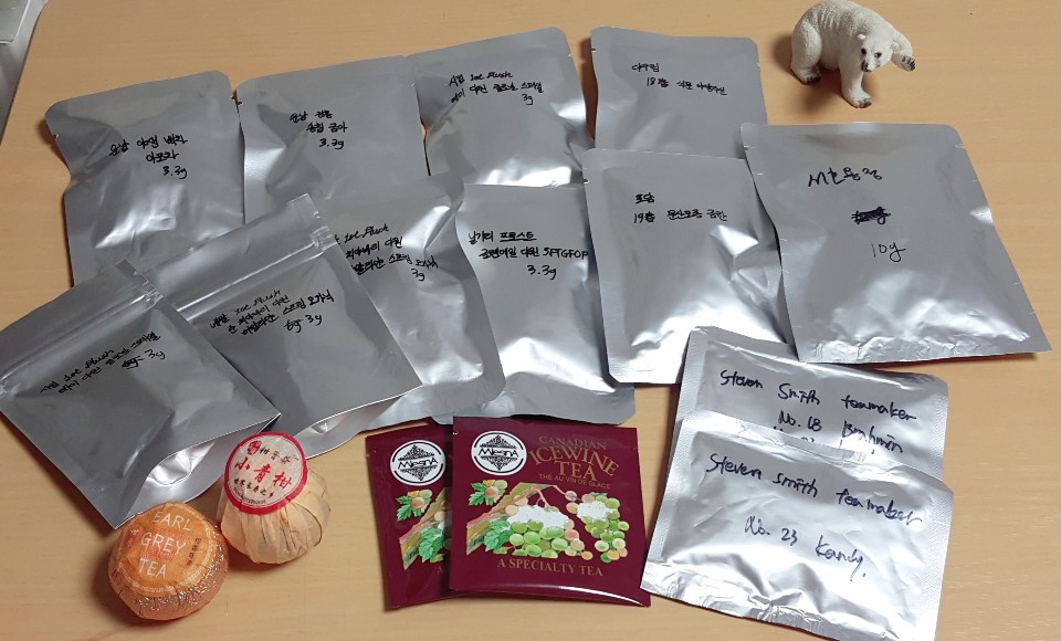 이런 어려움을 안고 몇 년이 지나면 낙엽이라고도 하기 뭣한 유물이 생깁니다. 2013년 햇차를 남에게 받아서 2020년까지 보관한다거나(그 분이 말씀하시길, '이 차도 월드컵이 보고 싶었을 수 있잖아요!'), 차 통이 크기라도 하면 눈에 띄는데 1회분, 5그람 정도씩 봉투에 작게 담아 놓은 차들은 '소분 차 바구니' 에 넣은 다음 몇 년씩 존재를 잊는 때도 허다합니다.