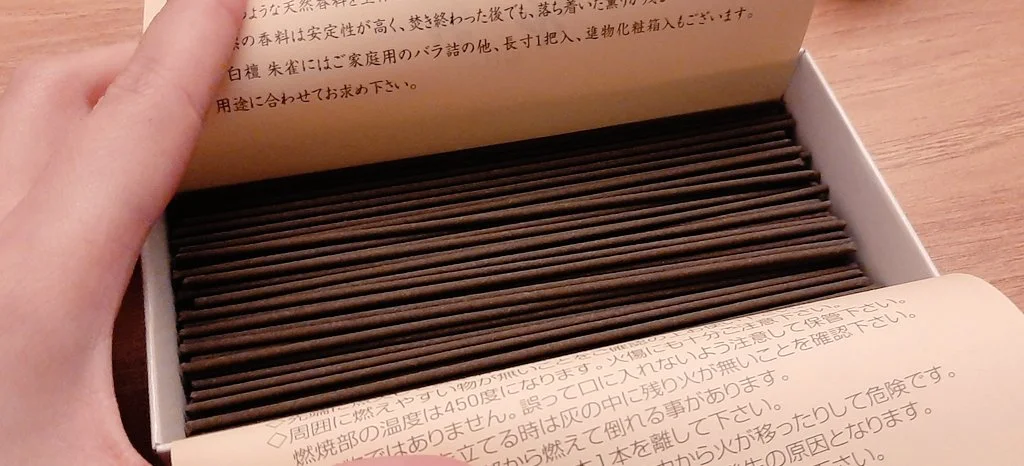 스자쿠(朱雀)는 이 노산백단에 계피, 감송과 같은 천연 한방 향료를 배합하여 만들어졌습니다.