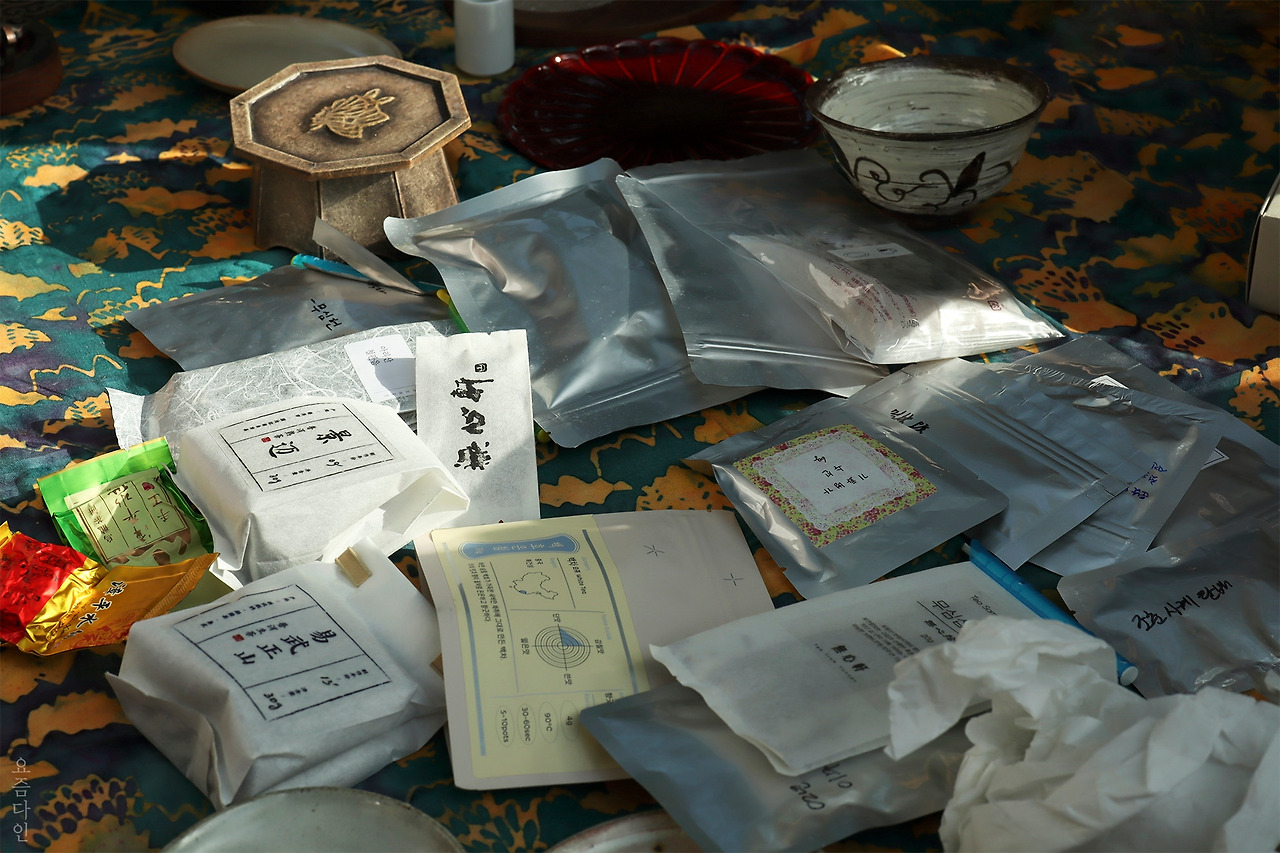 도착하자마자 짐을 풀고 주변을 돌아본 뒤 해가 지기 전에 계곡에서 찻자리를 가졌습니다. 사람이 모이면 차도 모인다고 다들 조금만 가져왔다며 꺼낸 차들이 모아보면 한가득이네요. 지금 이 순간에 어떤 차가 좋을지 의견을 나누는 즐거움으로 다회가 시작됩니다.