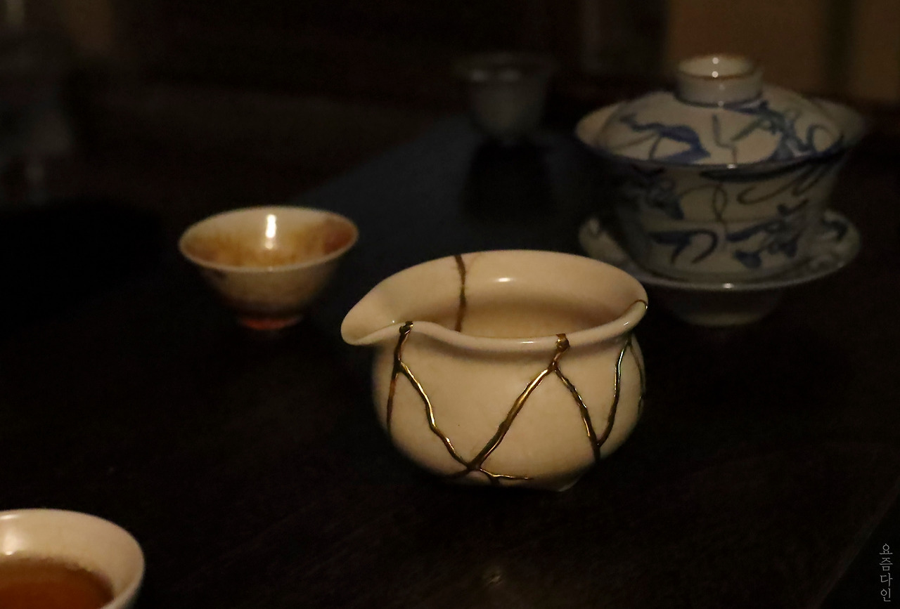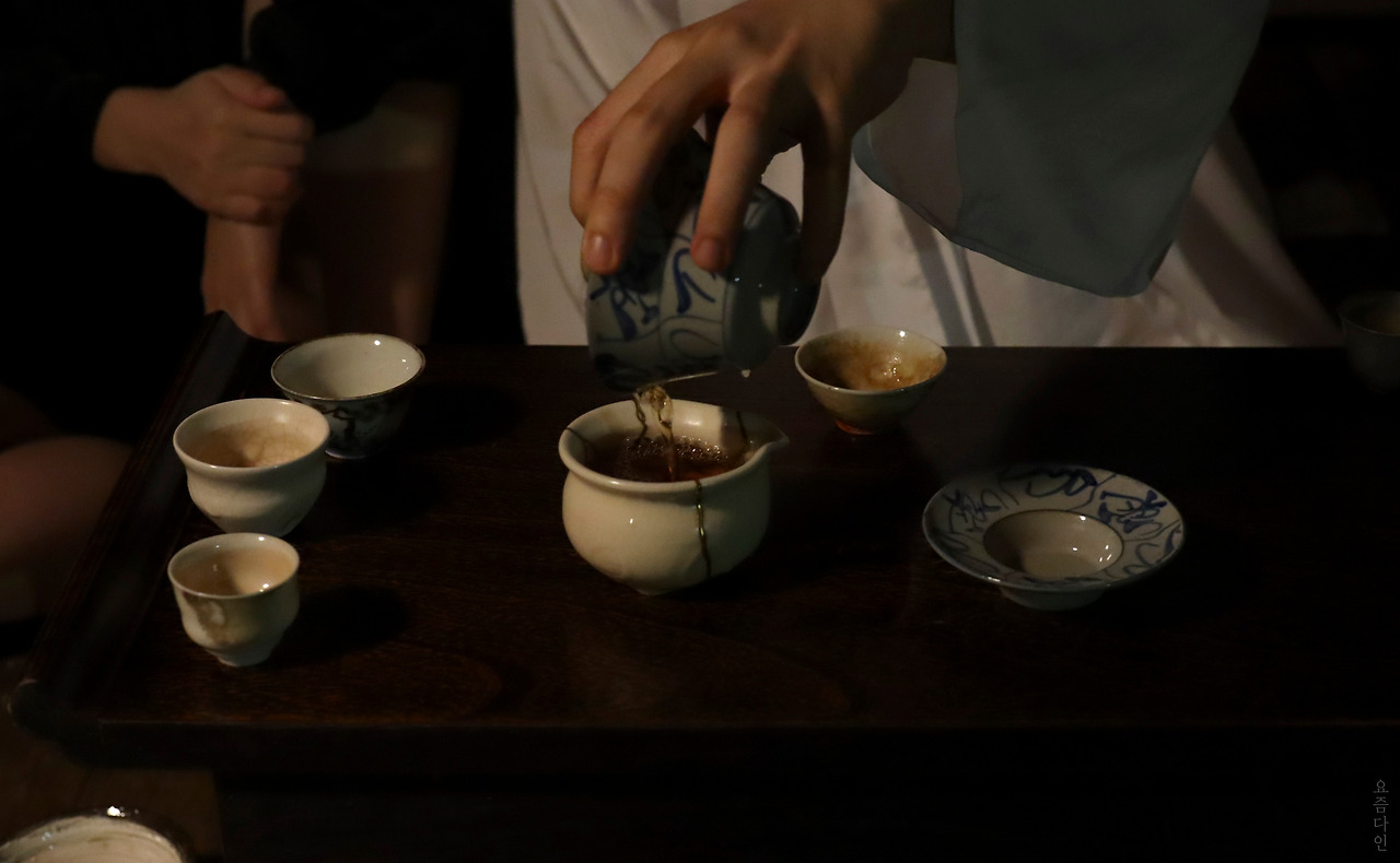 차 뿐만 아니라 가져온 기물들도 다양해서 이 자리를 빌어 새로운 기물을 개시하기도 하고 서로의 기물을 바꿔서 사용해보기도 합니다. 작은 조립식 사방탁자를 세운 뒤 어떤 기물을 올리고 화병은 어떻게 장식할지 고민하는 시간, 새로 개시하는 갈대가 그려진 다완이 가을밤에 흔들리는 갈대와 둥근 달 같아서 정취에 젖어들고, 깨졌다가 막 수리를 마치고 돌아온 숙우를 개시하며 함께 나누는 기쁨.