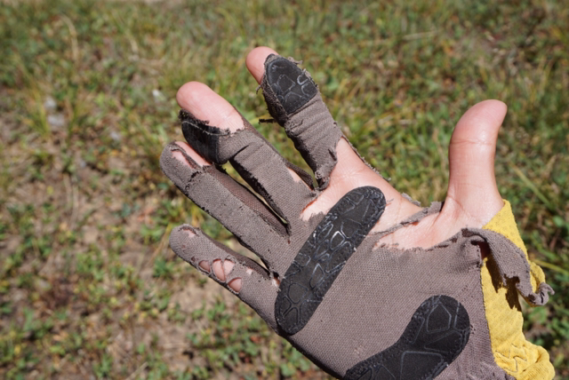 찢어진 신발, 몇번을 꿰매서 신은 양말, 다 찢어져 손바닥 절반이 드러나 보이는 장갑,