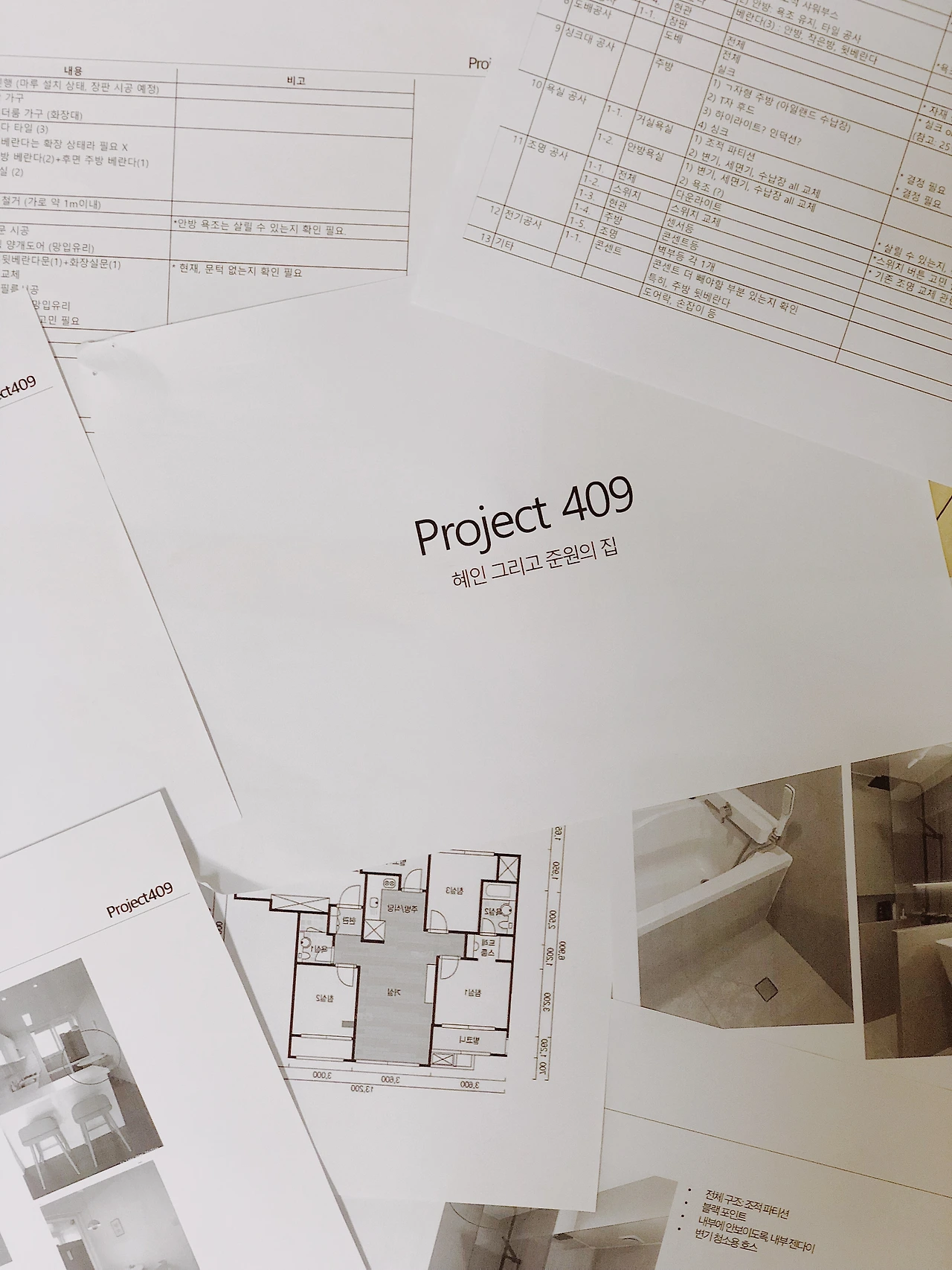 나 역시 셀인으로 하고 싶었지만, 둘 다 직장인이라는 어려움으로 턴키로 진행할 수밖에 없었다. 대신 '셀인 같은 턴키'로 진행한다는 마음을 먹고 시작했다. 인테리어 업체에 사기를 당하지 않기 위해 셀인 카페에서 인터넷 자료를 찾으며 준비했다. 용어에서 뒤지지 않기 위해 생소한 건축 용어를 익히고, 각 공정별 적정 단가 수준도 파악했다. 밤낮으로 인테리어 사례를 보며 어느 정도 공부가 되었겠다 싶었을 때 구체적인 레퍼런스와 요청 사항을 담은 요청서를 제작했다.