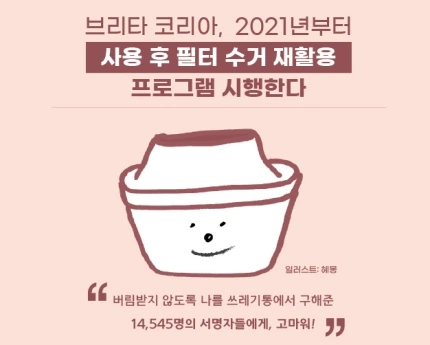 필터를 4주에 1번 교체해야 하는데 이 필터가 결국 플라스틱 쓰레기라는 점이 가장 큰 단점이었다. 하지만 여러 시민들이 <브리타 어택>을 통해 1년간 목소리를 내 준 덕분에 올해부터 공식 필터 회수 프로그램을 만들 계획이라는 좋은 소식!