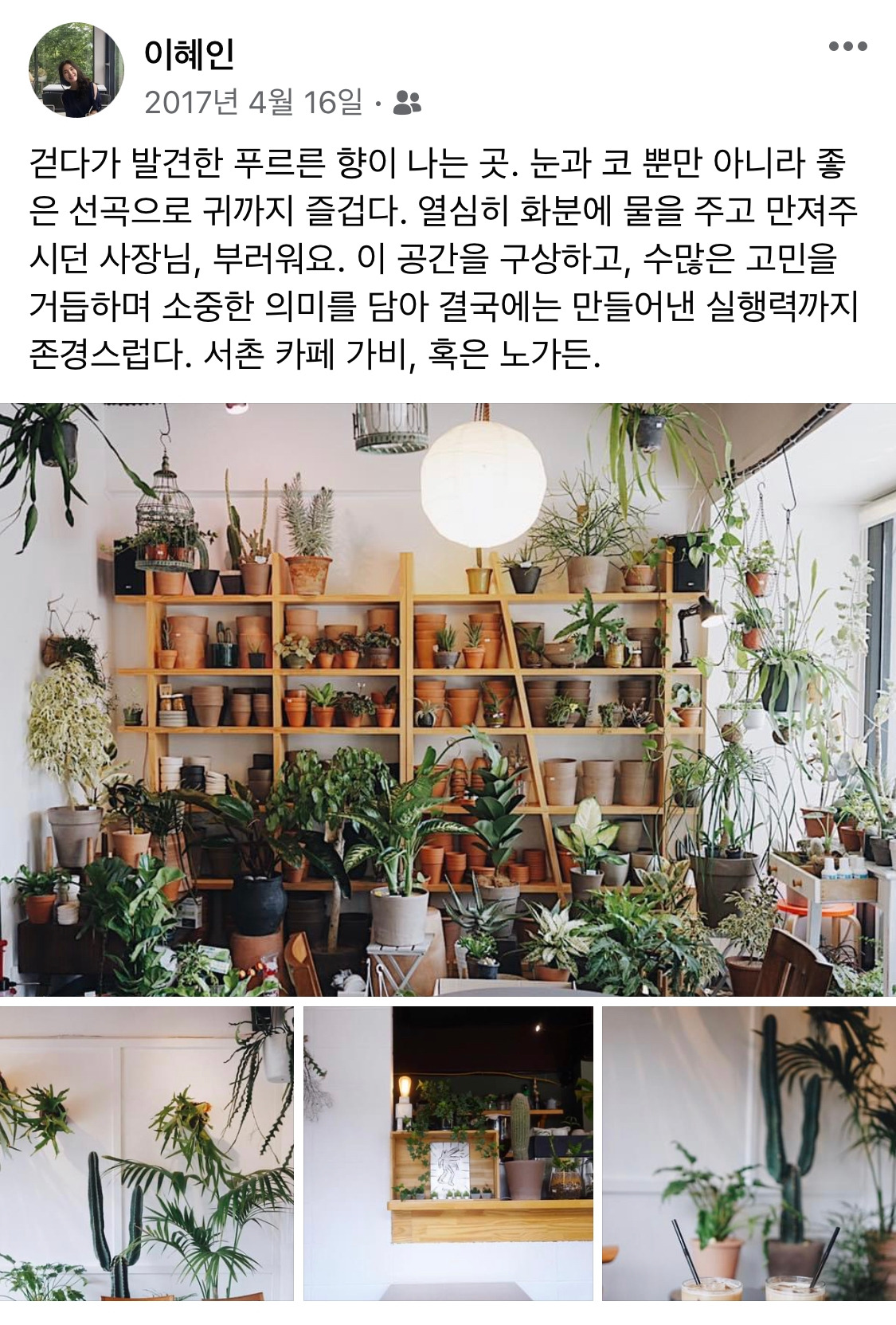 페이스북이 4년 전 오늘을 알려주었다. 경복궁역 오피스텔에 자취를 하고 있던 그때의 나는 서촌에서 주로 놀았다. 통인시장 근처 길가에 꽃을 정말 눈에 띄게 많이도 심어둔 누군가의 집이 자주 나의 눈길을 끌었다. ‘서울 꽃으로 피다 캠페인’ 에도 선정된 집. 세련되기보단 투박했지만 그 나름대로 예뻤다. 분명 길을 오가는 타인을 위한 마음씨일 거라는 생각에 기분이 좋아지는 집이었다. 지금은 듀 가르송 토분을 파는 서울의 유일한 오프라인 숍으로 훨씬 유명해진 서촌의 ‘노가든’ 에도 갔었다. 그땐 커피를 파는 카페이기도 했다. 작은 테이블 몇 개뿐이었는데 그곳에서 받은 인상은 무척 진했다. 플랜테리어를 주제로 한 카페가 서울에 많지는 않았을 무렵이라 꼭 외국에 있는 것 같은 느낌을 받았다. 언젠가 이런 공간을 꾸리고 싶다는 생각도.