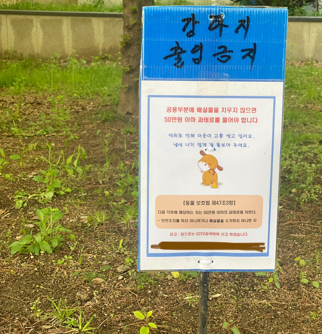 사유지가 아닌 이상 일개 아파트 입주민이 아파트 공용 공간에 출입 금지라는 권리를 요구할 근거는 없다. 추정컨대 해당 화단 앞에 사는 1층 주민이 아닐까 싶다. 다른 사람들이 거실이 보일 수 있는 화단에서 산책하는 것에 프라이버시면에서 불편함을 느꼈다면 “불편하오니 조금만 배려해주시기 바랍니다. 배설물은 반드시 치워주셨으면 합니다.”라고 예의와 개념을 갖춰 요청했어도 될 일이다. [출입 금지]는 명백한 반려견 혐오다. 지레 겁먹는 일이길 바라지만, 최근 사회에 만연한 혐오 범죄를 보건대 해로운 살충제라도 치지 않을까 무섭다.
