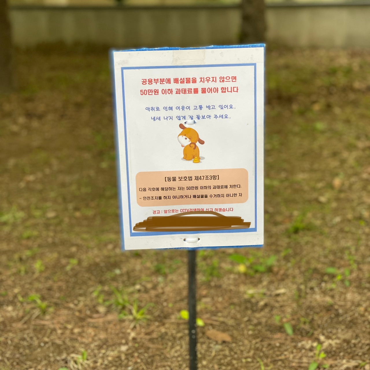 관리사무소에서 붙인 안내문이야 이해가 간다. 나 역시 펫 샵에서 당당하게 강아지를 사거나, 오프 리쉬를 하거나, 배설물을 치우지 않는 무개념 견주들에게 몹시 분노하는 사람이다. 성숙한 반려견 문화가 정착하기를 바라는 마음이 누구보다 크기에, 뉴스에서 알려주어도 여전히 못된 습관을 버리지 못한 사람들을 위한 공식 안내문은 환영한다. 하지만 저 파란색 글씨는 다른 의미로 할 말을 잃게 한다.