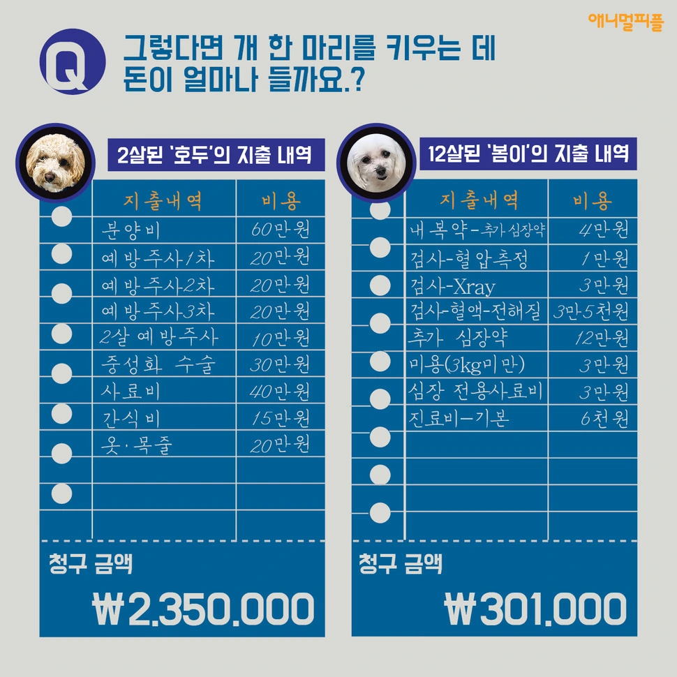 반려동물 키우면 좋다. 귀엽고 사랑스럽고 세상에 내 편이 하나 더 생긴 것 같죠. 하지만 반려동물은 그냥 크지 않는다. 밥도 먹어야 하고 병원도 가야한다. 얼마나 들까? 20년 동안 한번도 아프지 않은 착한 개라도 1000만원 이상이 필요하다. 모든 생명을 대할 때는 책임있는 자세가 중요하다.