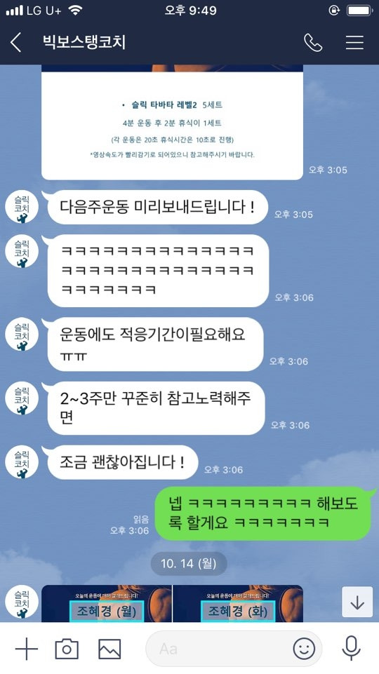 첫 수업을 받고 스스로 참 많이 반성했다. 내가 내 몸 관리를 정말 안 했었구나, 기초대사량이 상당히 낮았구나 내 몸은 쓰레기였구나 지방덩어리였구나 등등 반성과 함께 맞이하게 된 근육통 역시 정말 최고였다. 계단을 내려가는 과정은 너무 고통스러웠다. 화장실 한 번 갈 때, 갈까 말까 좀만 더 참을까.. 엄청난 고뇌의 시간이 있었던 건 함정 그래도 시작이 반이라는 말이 있지 않던가, 한 번 시작했으니 포기하지 말고 최대한 해보자!라는 마음으로 내가 할 수 있는 최선을 다하려 노력했다. 코치님들께 칭얼거린 건 안 비밀 뿌에에엥