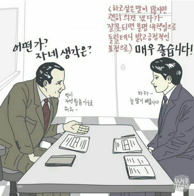 평소에 네이버 웹툰을 즐겨보는 편이다. 그중 직장인들의 마음을 재밌게 잘 표현한 웹툰을 살포시 소개하면 글을 시작해보려 한다. 네이버 웹툰의 '잡다한 컷'을 보면 직장생활을 하면서 한 번쯤 경험해봤을 상황들을 유머러스하게 표현해 내었는데 요즘처럼 취업이 어려운 시절에도 상황은 크게 다르지 않은 듯하다. 바늘구멍 같은 취업 관문을 힘겹게 통과하고도 얼마 지나지 않아 자진 퇴사하는 직장인들이 늘고 있다.