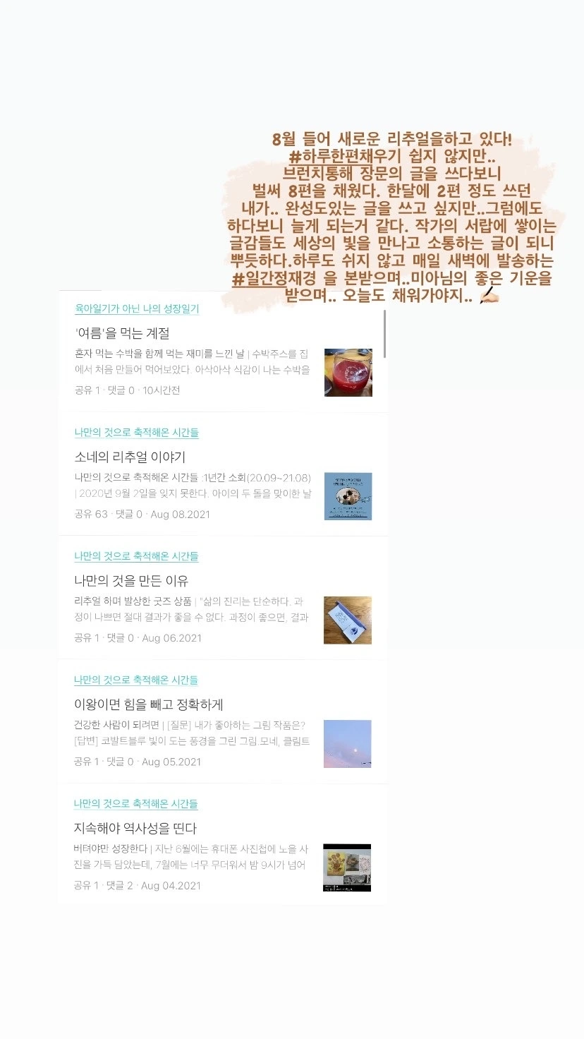 무얼 시작하면 작심삼일이 아닌, 열 번을 채워보라고 조언해주고 싶다. 그래야 습관이 제대로 일상에 무르익을 수 있을 테니깐. 8월 1일 이후 매일 브런치에 쓰는 #하루한편채우기 리추얼도 오늘 맞아 10편의 글을 채우게 되었다.