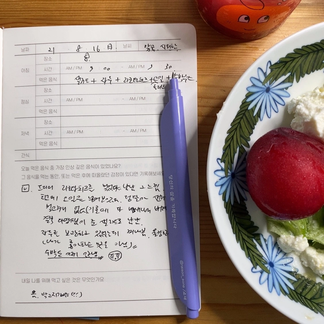 일어나면 무의식적으로 쓰는 리추얼 노트 대신 음식 일기장을 꺼냈다. 먹으려던 샐러드가 상해서 동료가 준 싱싱한 샐러드를 다시 꺼내 먹고 보관해두었던 자두 몇 알을 꺼내 두었다. 어색한 조합이지만, 나를 위로하는 아침상이라고 생각하니 그나마 먹을만하다. 제법 아침에 더운 기운보다 선선한 바람 기운으로 가을이 왔다는 걸 느끼며.. 더 이상 수박을 못 먹는다는 아쉬움에 남아 있는 수박주스를 꺼내보았다. 처음 만들어본 주스, 정말 잘 만들었지... 아이도 흡족하며 먹었던 순간을 떠올리며 한 모금 마셨다.