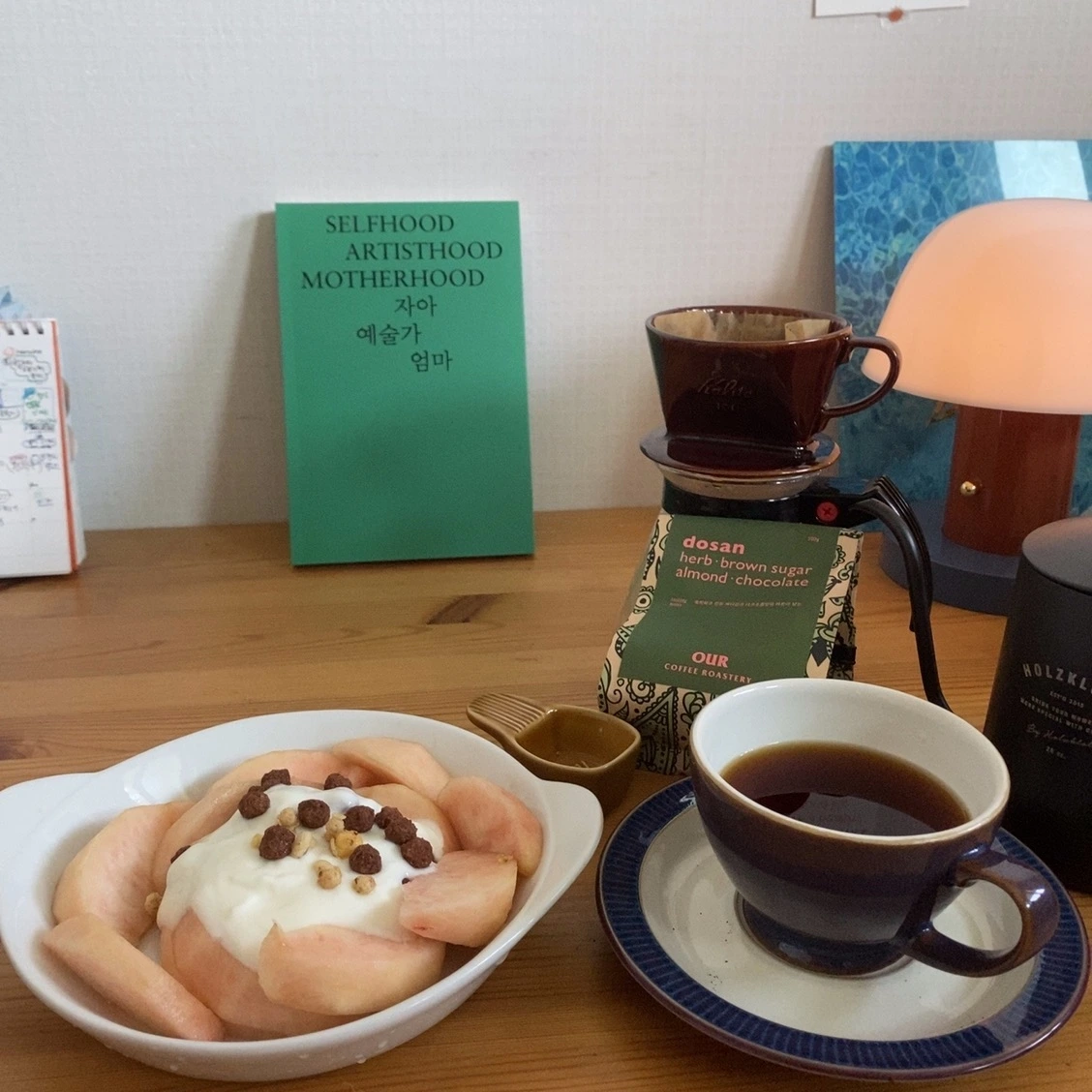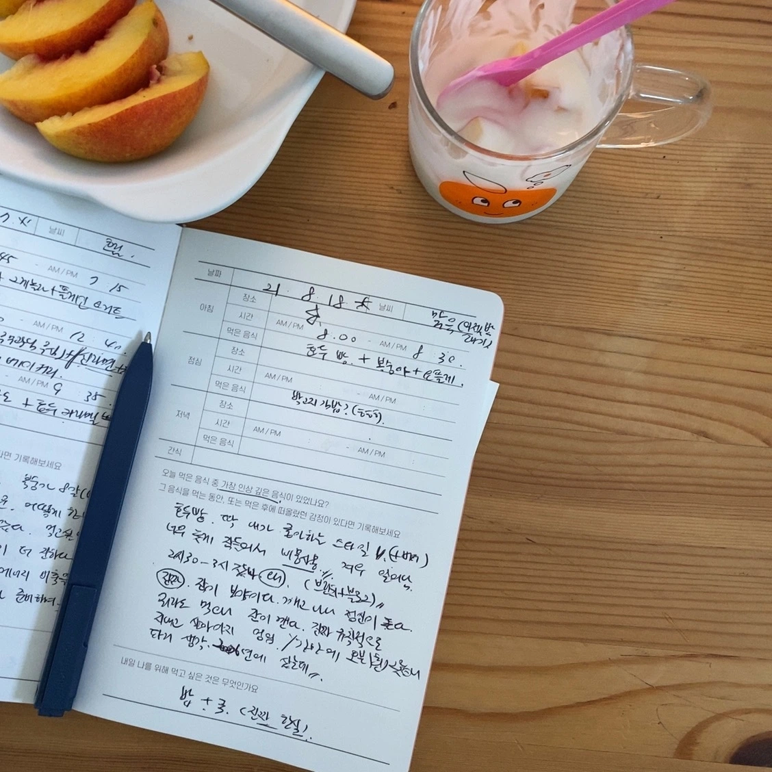 어제 참여한 줌회의 워크숍에서 자기소개하면서 질문을 하셨어요. 오늘 기분이 어떠신지.. 5점 만점에 4.8점인 하루였어요. 좋아하는 서점을 두 곳을 들르고 저녁은 안 먹었지만 하고 싶은 걸 마음껏 하는 저녁시간이었어요. 아침에 일어나니 오른쪽 눈이 빨갛더라고요. 며칠 무리해서 새벽에 자다 보니. 몸의 컨디션은 좋지 않았나 봐요. 어젯밤에 기분이 흥취 되어 좋아하는 비비큐 후라이드 치킨도 먹었거든요. 그러다 보니 아침이 당기지 않더라고요. 복숭아에 요구르트, 참 좋은 메뉴인데 씁쓸한 커피가 더 끌린 아침이었습니다.
