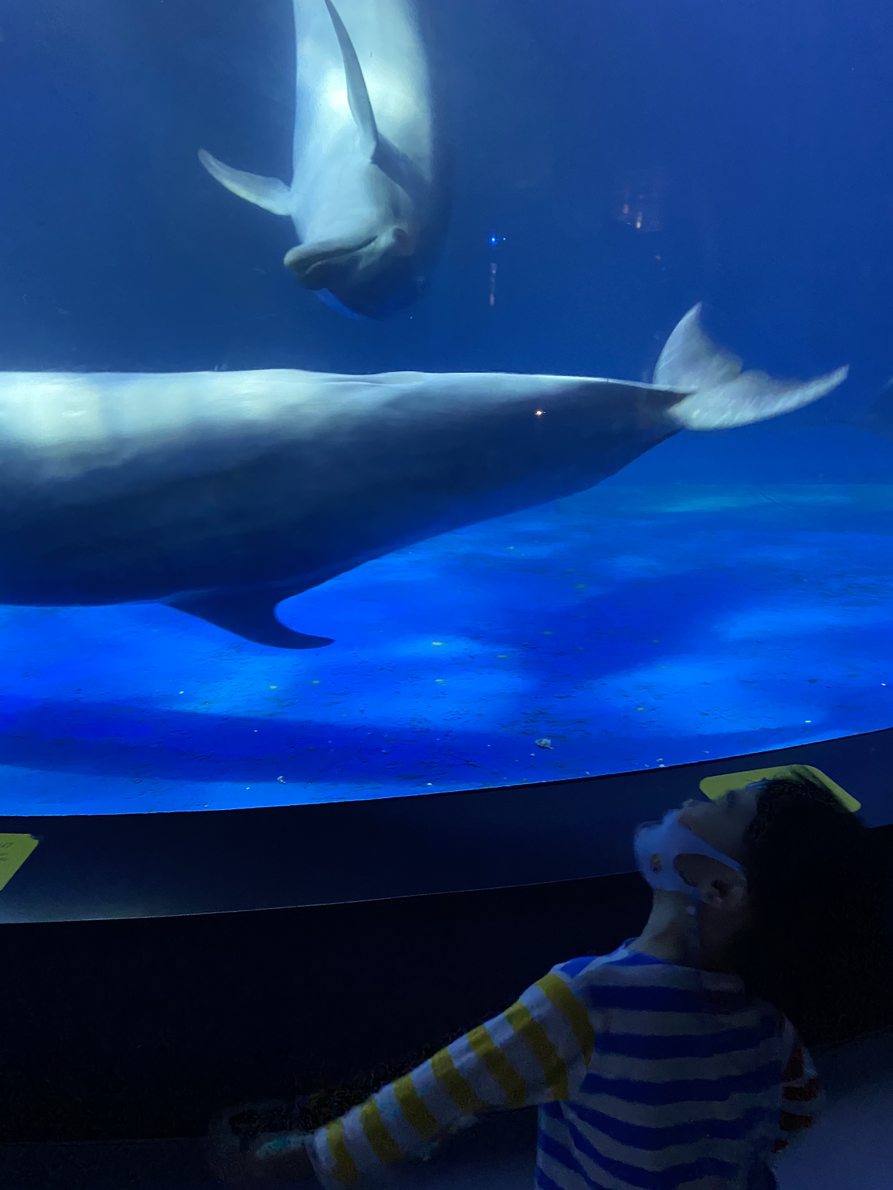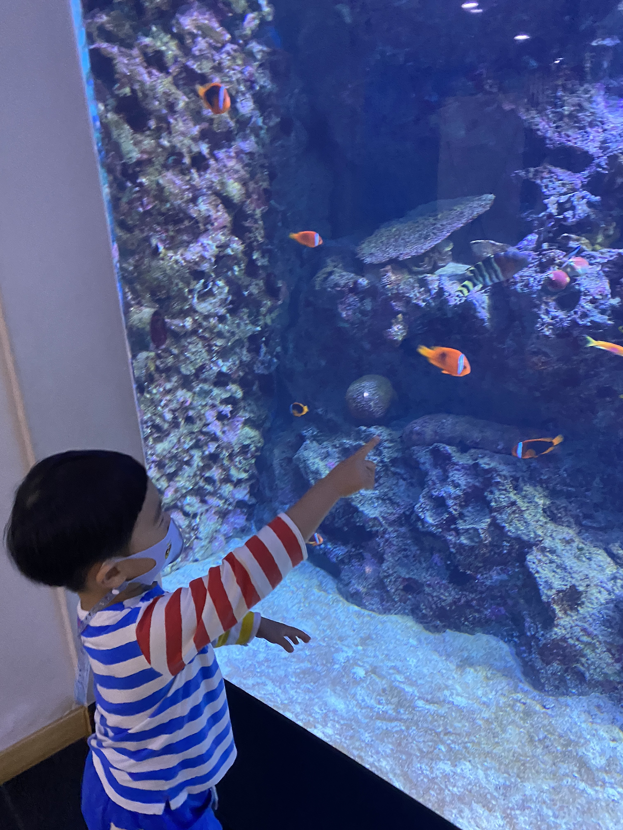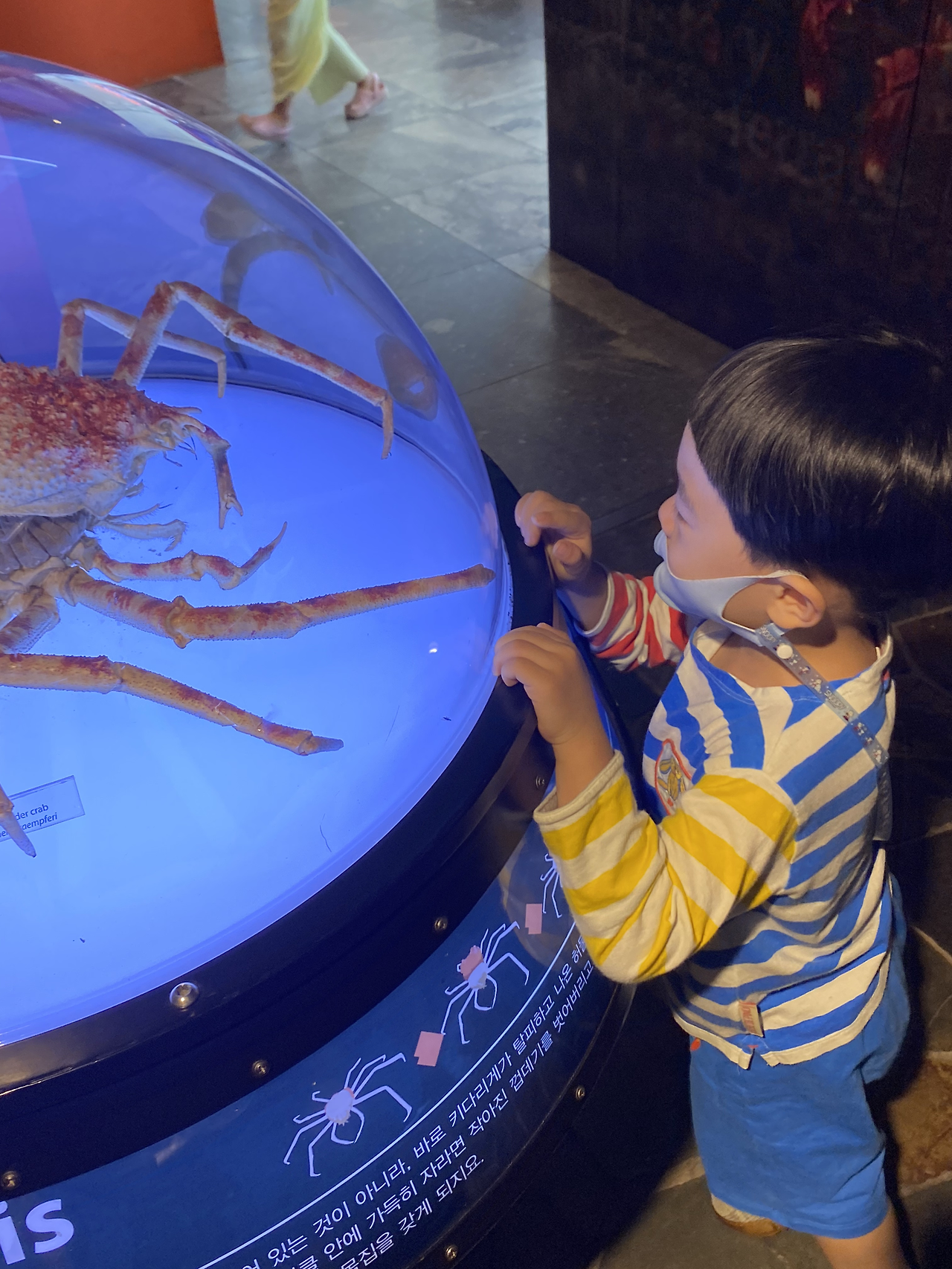 예상대로 아이는 1시간채 안되어서 아쿠아리움을 잰걸음으로 둘러보고 나와 남편을 재촉하며 아쿠아리움에서 나가자고 했다. 나 혼자 자리에 멈추어 그 동물들의 생김새를 찬찬히 살펴볼 뿐이었다. 돌 이후 잠자리에 들 때 고래, 상어, 악어 등 생태사진집을 보며 동물들의 모습을 탐구했던 아이였는데, 실제 동물들을 살펴볼 때 마치 퀴즈를 푸는 것 마냥 ''흰동가리 해마 있네~ 가오리다~! 고래네~" 등 동물들의 이름을 맞추고 자리를 빠르게 떠났다.