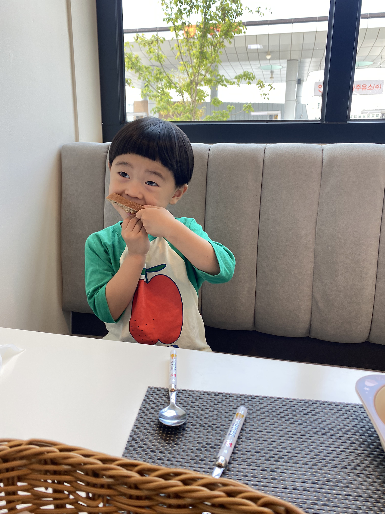 그런데 오늘은 달랐다. 매우 신기한 동굴 탐험을 하는 마냥 눈은 호기심으로 가득 찼다. 함께 소리를 지르며 그 상황을 즐겼다. 세차가 끝난 후 매번 눈여겨본 레스토랑으로 자리를 옮겼다. 늦은 점심시간이라 자리는 한산했다. 세차를 하면서 전화로 식사 문의를 했는데 레스토랑 직원 분의 센스가 돋보였다. 아이를 위한 테이블 매트를 준비해주신 것이다. 완전 감동.. 자신을 위한 자리를 눈여겨본 아이는 덩달아 기분이 좋은지 자리에 앉아 표정으로 온갖 기쁨의 미소를 띄었다. 나와 비슷한 취향 메이트라 아이도 좋아할 줄 알았다.
