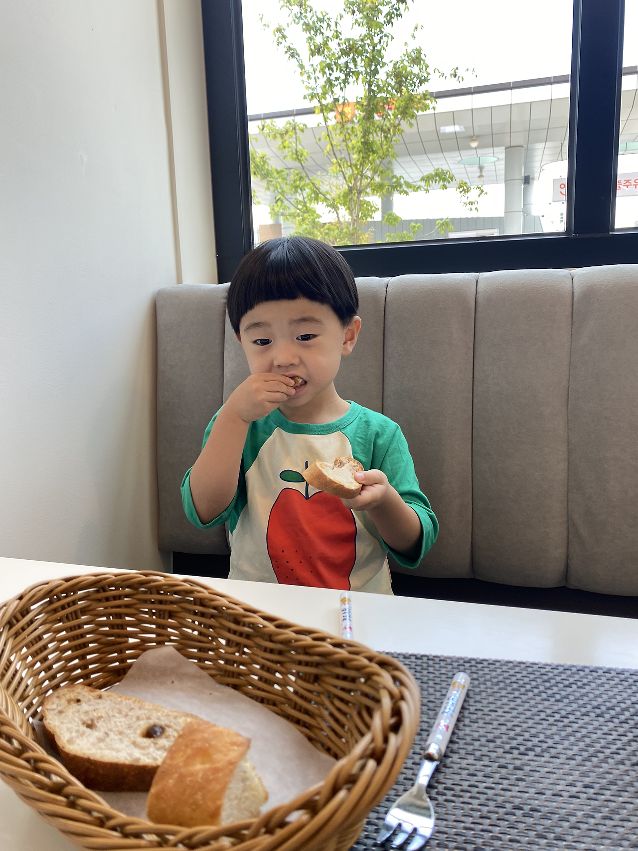 아이를 위한 버섯 크림 리소토(리조또는 잘못된 외래어표기) 와 나를 위한 알리오 올리오 파스타를 주문하고 식전 빵을 먹었다. 리소토는 아이가 먹게 되니 향신료(후추)는 빼 달라고 추가 요청했다. 서로 눈을 마주치며 물잔을 짠! 건배했다. 식사가 준비되자 아이는 나의 파스타에 눈독을 들였다. 너무나 빤히 애타는 눈빛으로 달라는 시늉에 마늘향과 올리브기름이 묻은 파스타에 물로 한 번 헹구어서 전해주니 "안 맵네"라고 말하며 맛나게 드셨다. 더 달라는 표정을 지으면서 리소토는 뒷전이고, 그릇에 얼굴을 파묻히며 열심히 파스타를 드셨다.