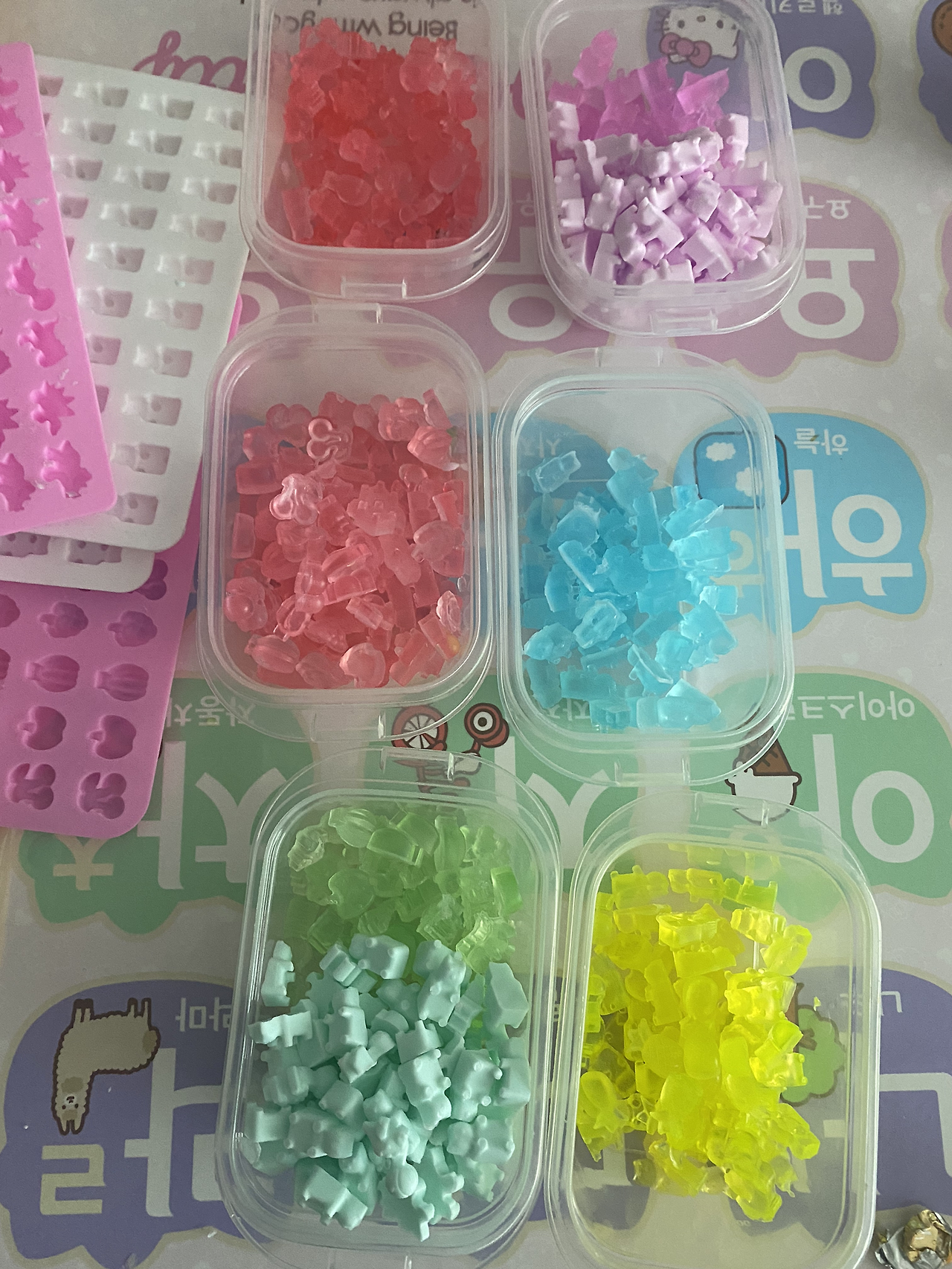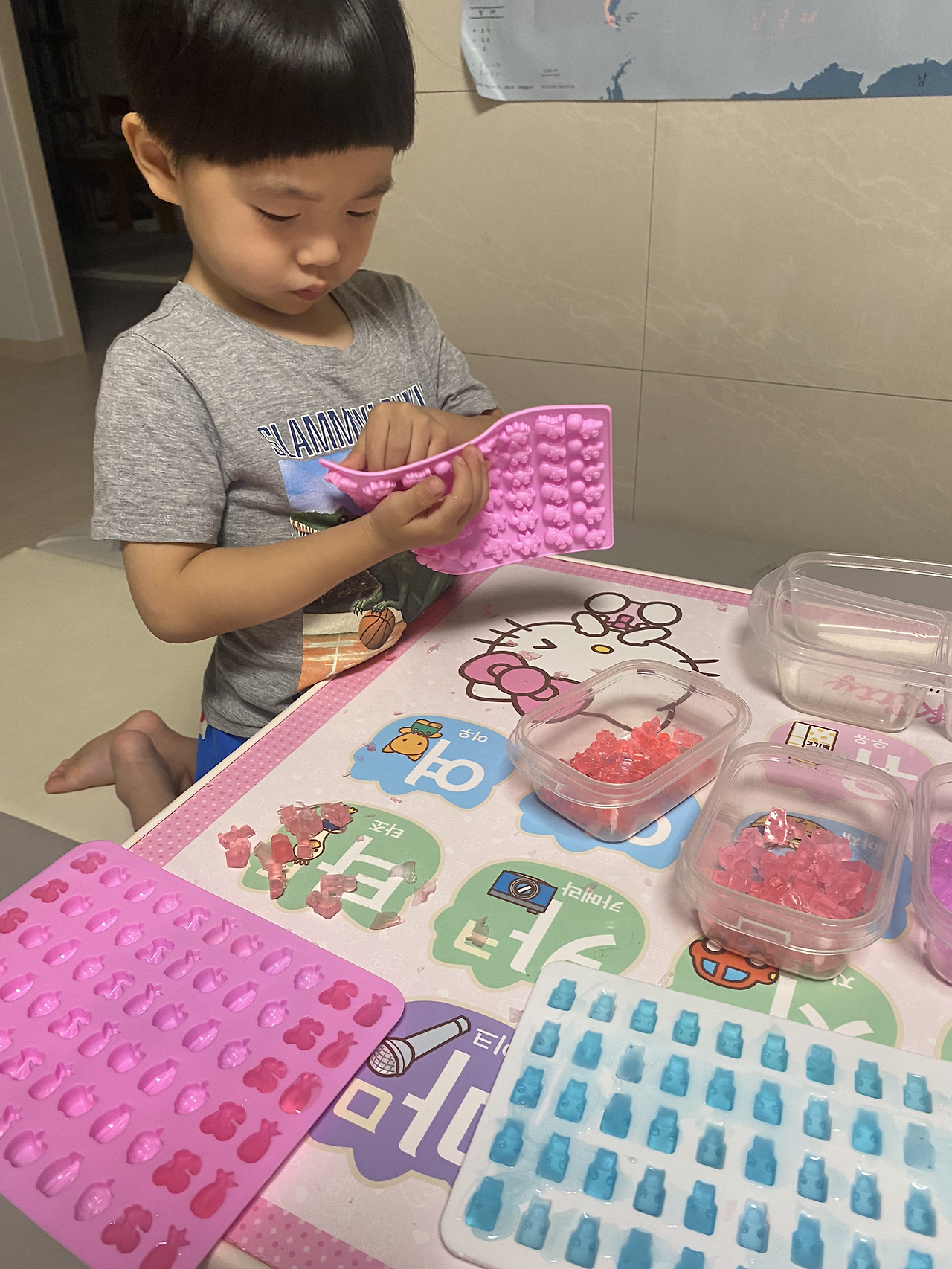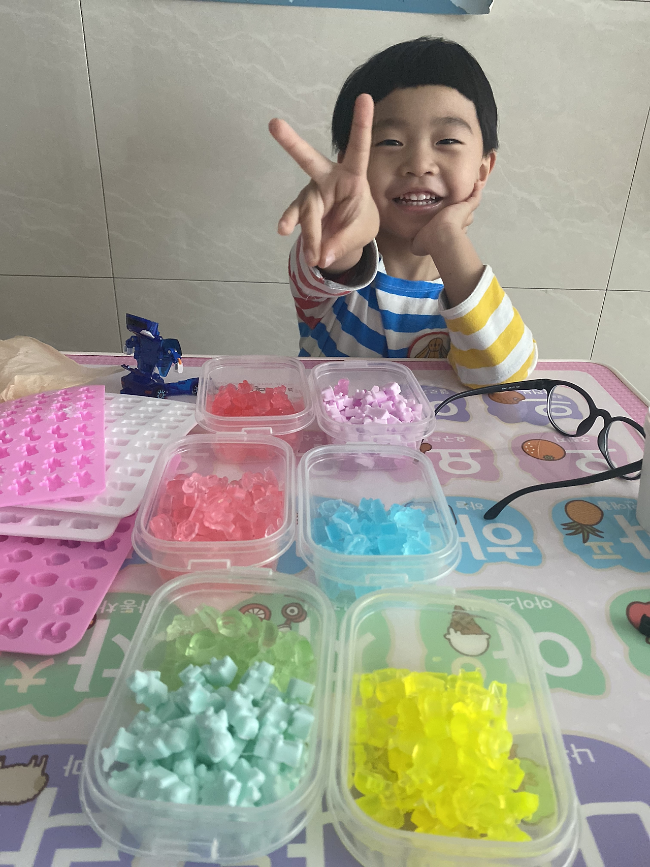 곰젤리와 닮은 곰젤리 모양의 비누를 제작할 수 있어서 여러 모형을 사고 아이와 함께 만들었다. 공룡, 과일 모형까지. 만들다 보니 내가 주체가 되어 가내수공업을 하고 있었다는… 반 친구(14명)들과 담임 선생님들께 드리려고 했는데, 작년에 같은 반 친구들 이름까지 다 소환하는 아이를 보며 쓴웃음을 지었다. 친구를 정말 좋아하는 꼬마.