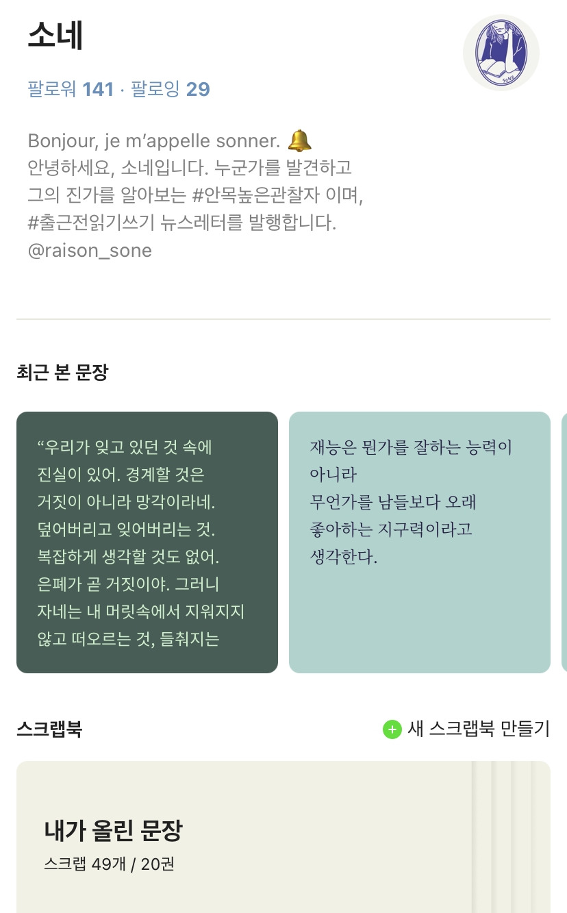 책을 좋아하는 사람들이 일상에서 책을 더 가까이할 시간을 많이 만들어주길 바라며.. 양서를 찾고 지적 관심사가 비슷한 사람, 나에게 맞는 책을 골라주는 플랫폼으로 우뚝 서시길(교보, 예스 24, 네이버 등 여러 플랫폼에 담긴 리뷰는 광고 리뷰도 종종 있고… 정말 왜 이 책을 선택하게 되었는지에 대한 본질적인 리뷰가 쏙 빠진 느낌이다. 지금 주목해야 할 책들은 수많은 이들이 남긴 문장을 통해 알 수 있기도 했다. 최근에 송길영 부사장의 <그냥 하지 말라> 책의 문구들이 꽤 많았다.)