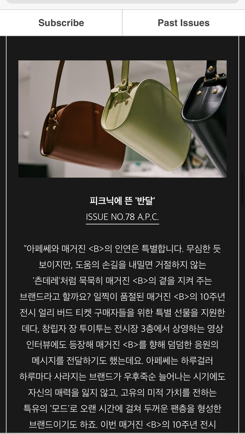 20대에도 지속적인 잡지사랑은 이어져서 패션지로 시선이 확장되며 다양한 피처 칼럼과 브랜드에 대한 관심이 커지고 있을 때쯤.. 여러 매거진들의 폐간 소식을 여러 차례 듣게 되었다. 오래도록 좋아했던 에디터분들의 행보도 시대와 트렌드에 맞춰 제각각 달라졌다. 스타일스트, 뷰티/패션의류 브랜드 창업가, 홍보마케팅 PR전문가 등.. 지속적으로 잡지를 만들기 어려운, 잡지의 미래를 논하기 어려운 시대에 새로운 형태의 잡지가 탄생했다. 이름하여 매거진 B.