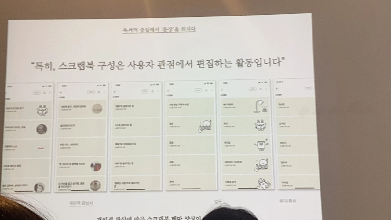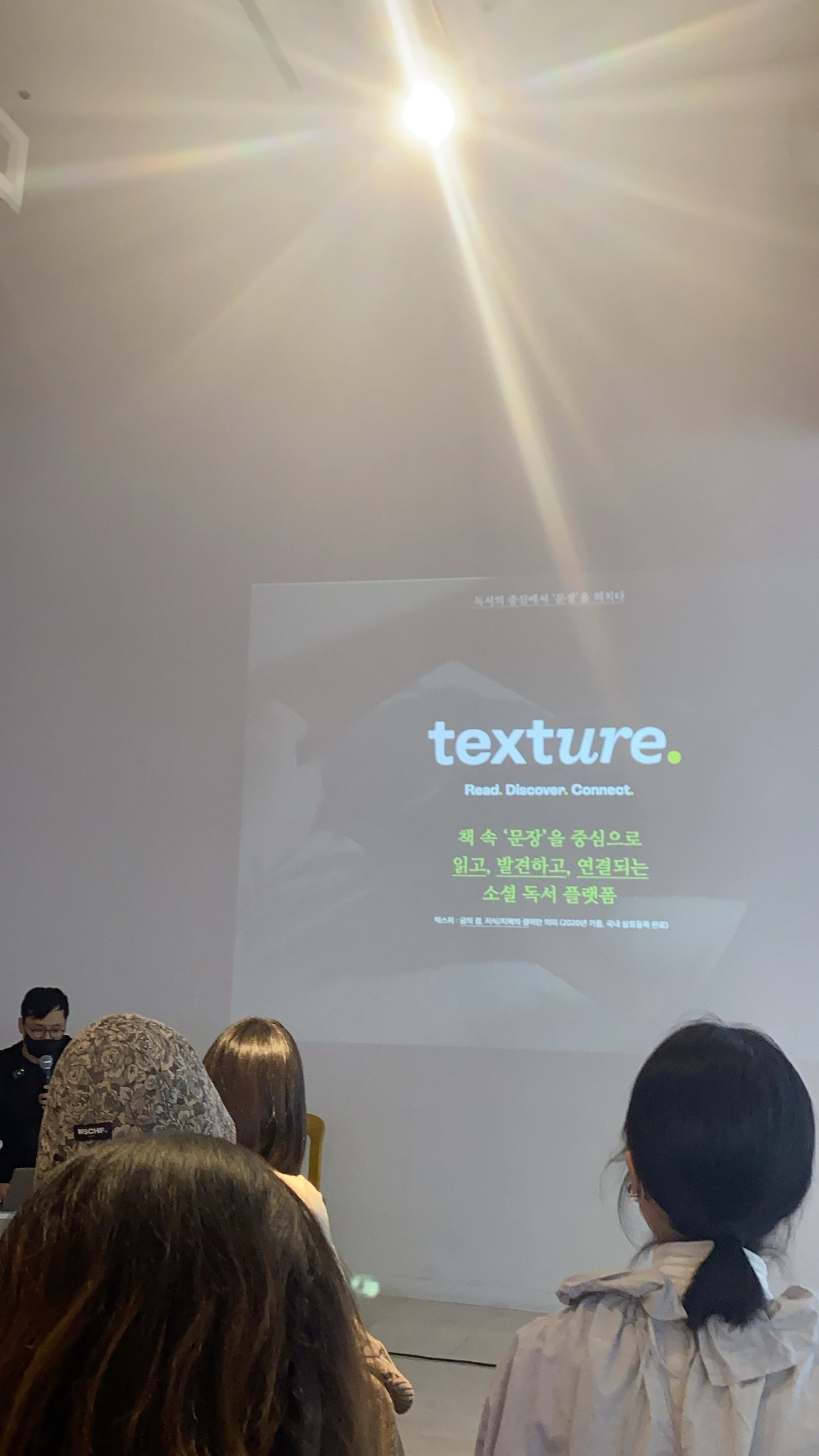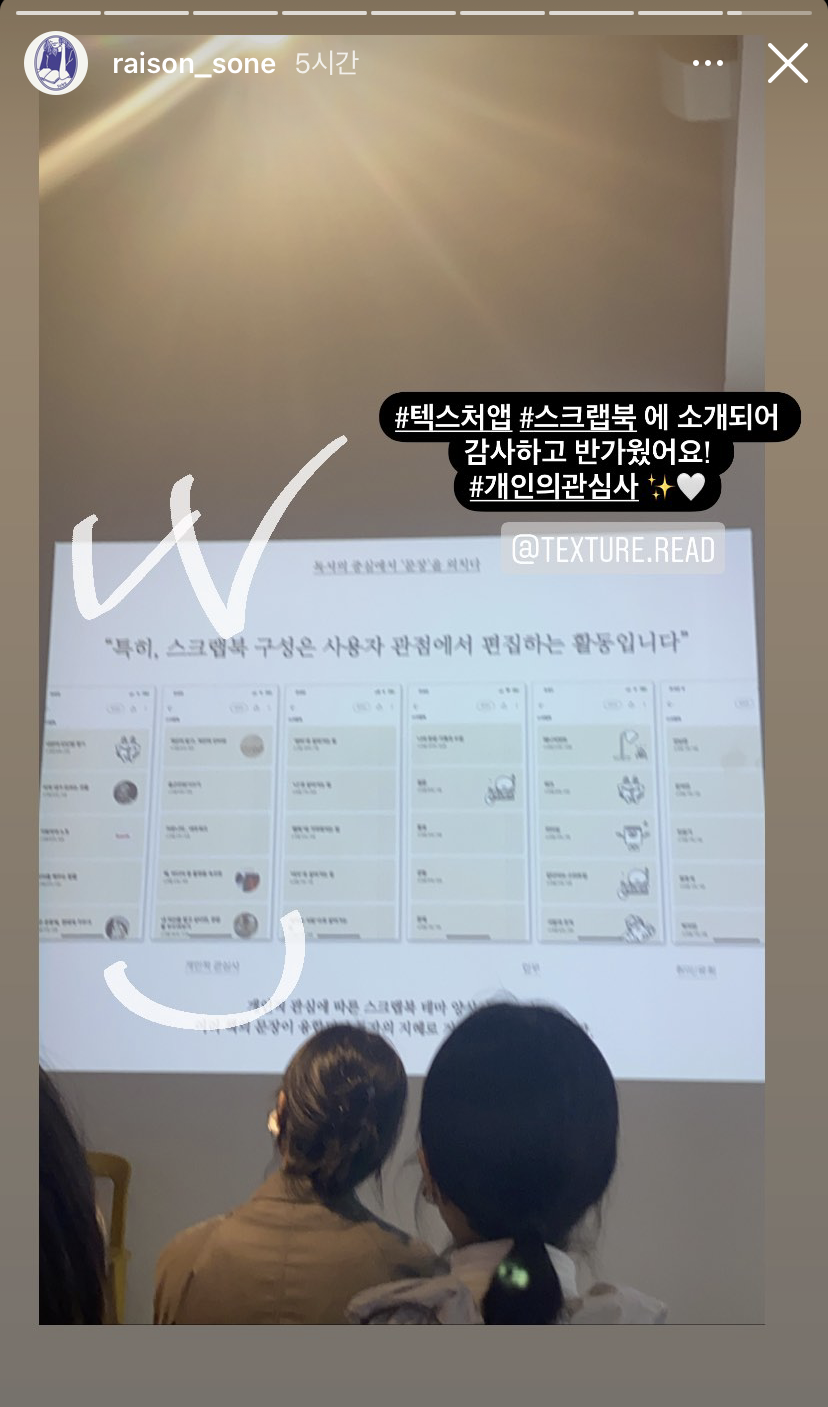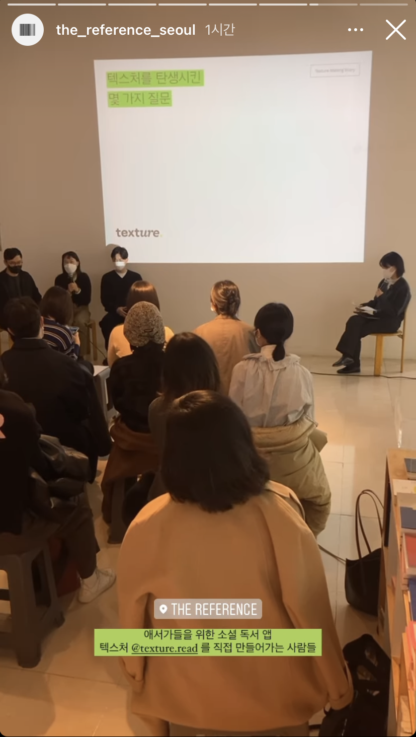 ‘어떻게 하면 좋은 콘텐츠를 만들 수 있을까..’에서 ‘콘텐츠를 잘 읽힐 수 있을까’.. 질문으로 전환하며 사업의 방향을 잡은 텍스처 앱, 두 달간 애용하며 궁금했던 점을 묻고 답하는 시간을 가지며 더 애정이 가득한 시선으로 이 플랫폼을 즐길 수 있을 거 같다. 나의 스크랩북도 발표자료에 소개되어 영광이었다. 아주 내밀한 시간을 만들어준 텍스처 앱을 만드는 분들께 감사한 마음을 담아.. 더레퍼런스 룸과 텍스처 앱의 만남도! 반가웠다.