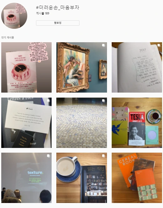 좋아하는 문장을 찾고, 세상을 바라보는 시야를 확장시키기 위한 간접적인 경험을 해보기 위한 것이 아닐까. 텍스처 앱을 만든 볼드 피리어드의 김치호 대표님 말씀대로 말이다. 오래도록 해시태그에 #더러운 손_마음부자라고 기록했었다. 돈으로 셀 수 없는 마음부자를 만들어준 책에 감사해서. 물리적인 공간이 아닌 눈에 보이지 않은 책 속의 상상 속 공간을 휘젓으며 저자의 머릿속을 적극적으로 들여보는 시간.