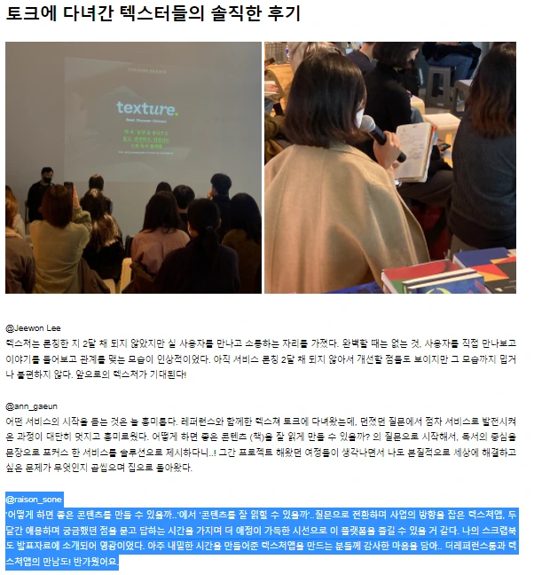 텍스처앱에서 발간하는 뉴스레터 '텍스처리드'에서 이날 행사에 대한 후기가 소개되었다. 레터 내용 중 나의 후기와 나의 모습까지 발견된.