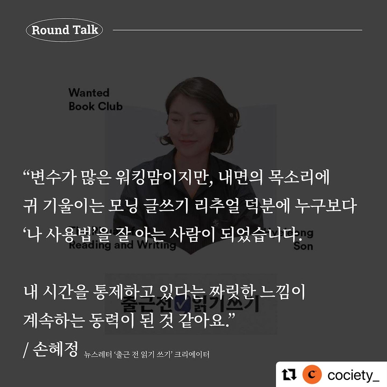 최소한의 내 시간을 확보하는 게 중요하고, 이걸 주변에 알리세요. 제 경우는 아이가 잠에서 깨기 전 (모닝) 리추얼 시간을 꼭 가지려고 노력해요. 그리고 체력과 나를 위한 에너지를 분배하고요. 나를 위한 에너지를 쓸 때 오히려 저는 생산성을 얻었어요. 처음에는 작게 작게 시작해도 괜찮아요. 누구나 시작은 할 수 있어요. 지속성이 어렵지만, 작게 시작해야 오래갈 수 있어요.(발췌. SOCIETY OF EDITORS)