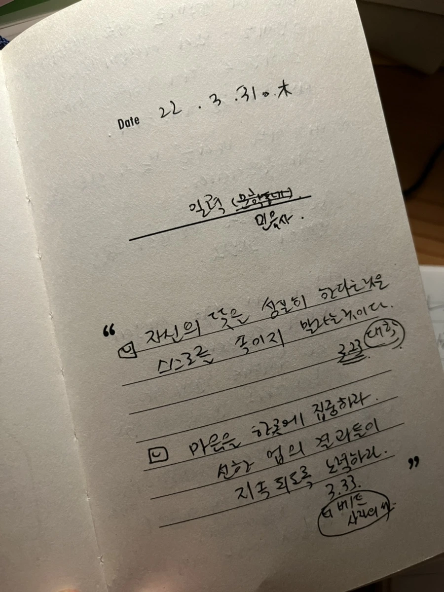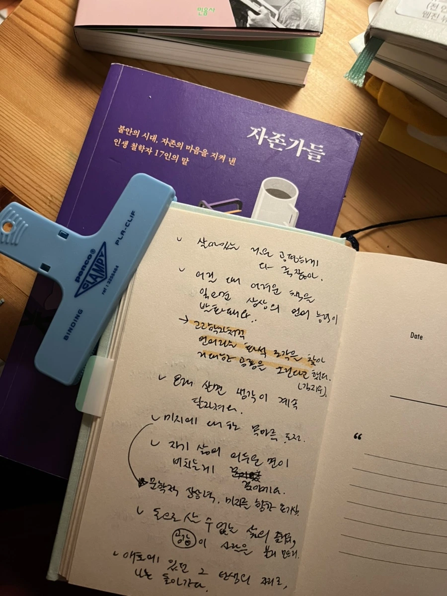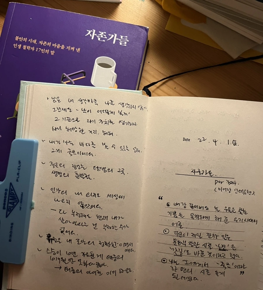 4월 1일, 필사 첫 책으로 김지수 기자의 <자존가들>을 폈다.일주일간 하루 1권, 총 7권의 책에서 내 마음에 들어오는 책을 고를 수 있다는 기쁨.